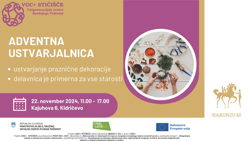 v petek, 22. 11. 2024, vas prijazno vabimo v prostore VGC+ Stičišče na ADVENTNO USTVARJALNICO. V prijetni družbi in ob skodelici toplega čaja bomo skupaj zakorakali v adventni čas.
