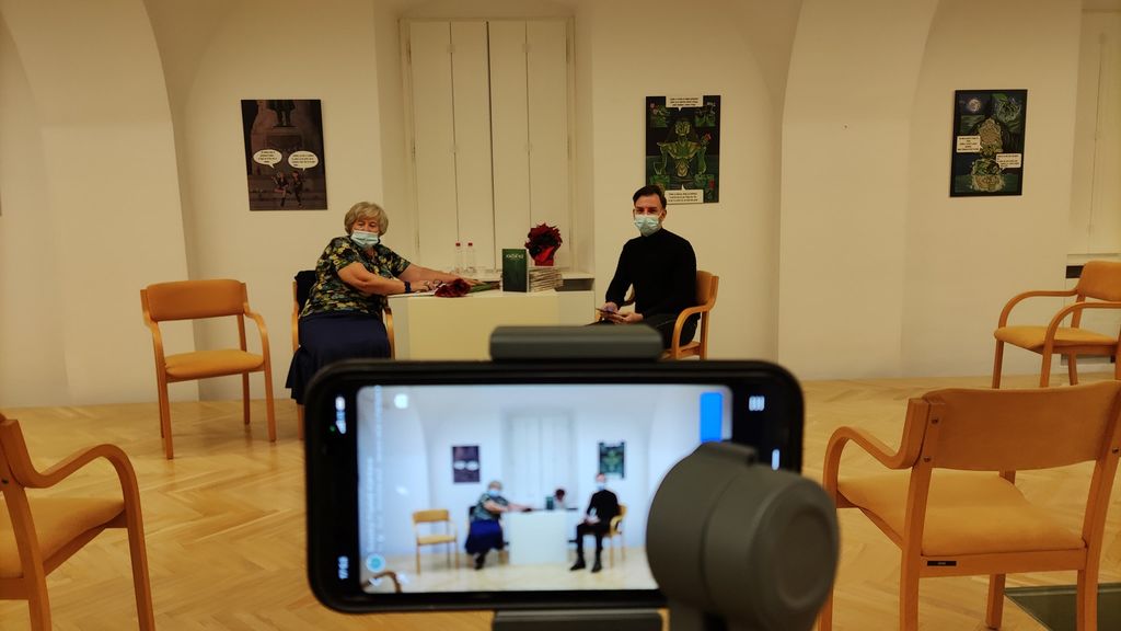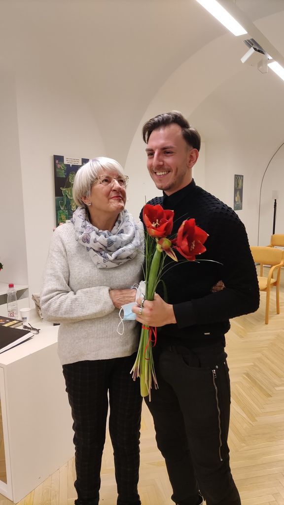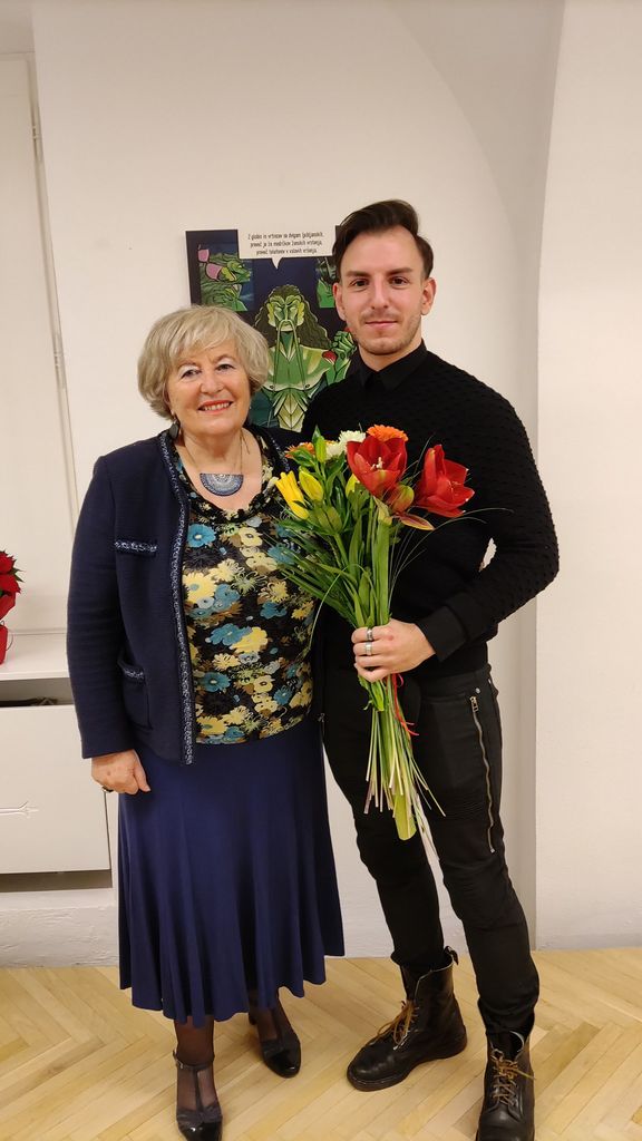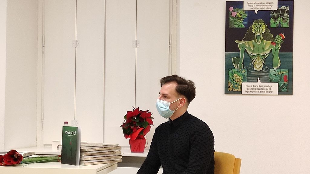 Predsednica našega društva, ga. Majda Vodušek Klemenčič, je z vprašanji izzvala našega gosta, da se predstavi, nam razkrije način svojega ustvarjanja in predstavi svoje delo sodobne interpretacije Prešernovega Povodnega moža v obliki stripa, ki ga je ustvaril za svoje diplomsko delo. Izvedeli smo, kako je rdeča pločevinka piva pristala v Ljubljanici in kako je po divji noči plesa izginila Urška Šefer.