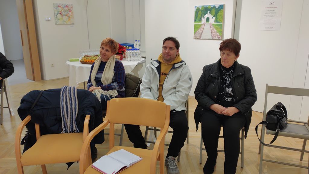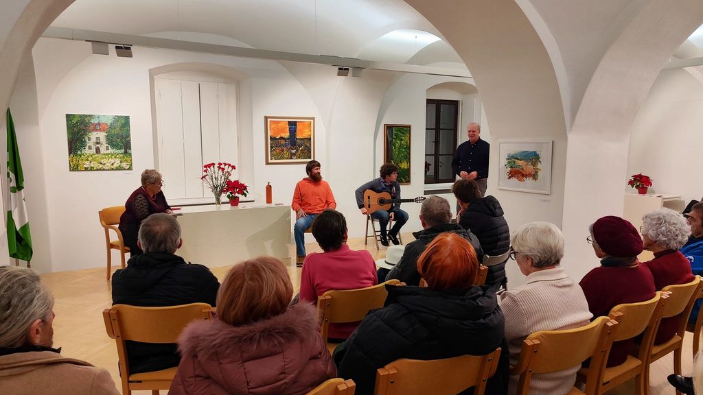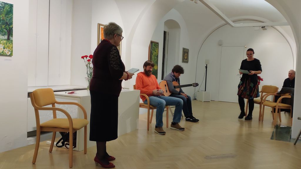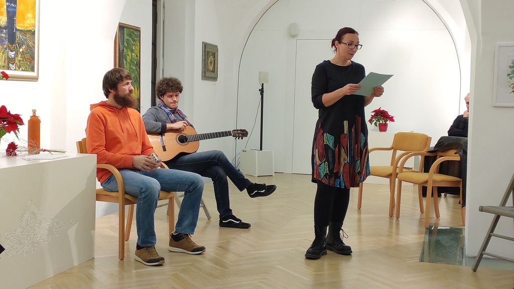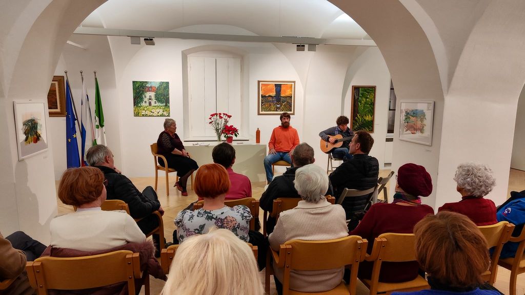V večer poezije so nas skupaj popeljali: Luka Gašparič s svojo kitaro in prijetnimi zvoki glasbe, naš gost z dihalno vajo in predsednica našega društva, Majda Vodušek Klemenčič, z recitacijo pesmi.