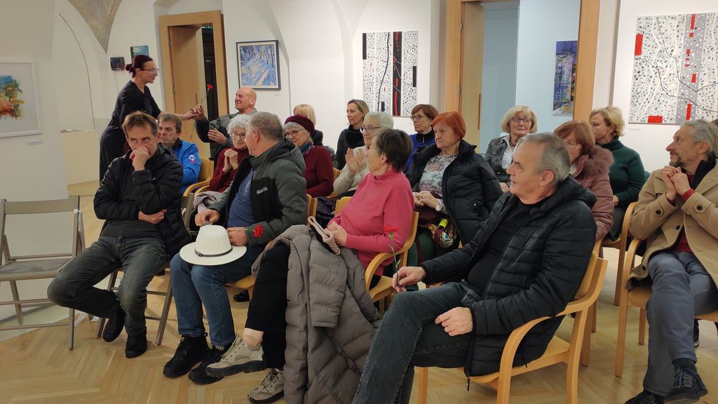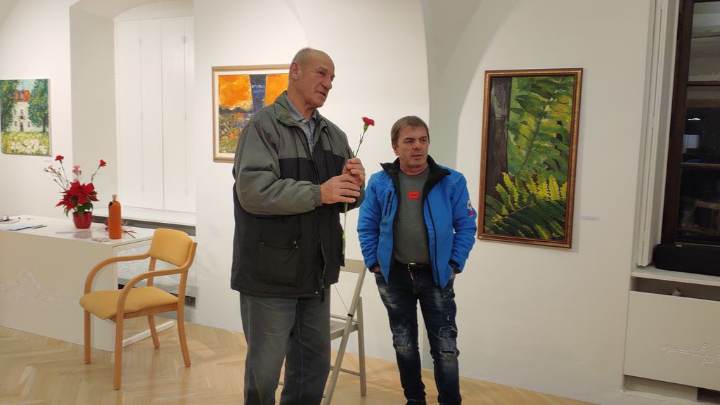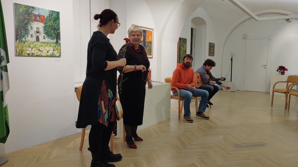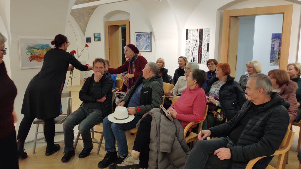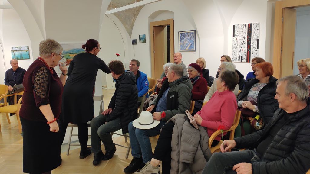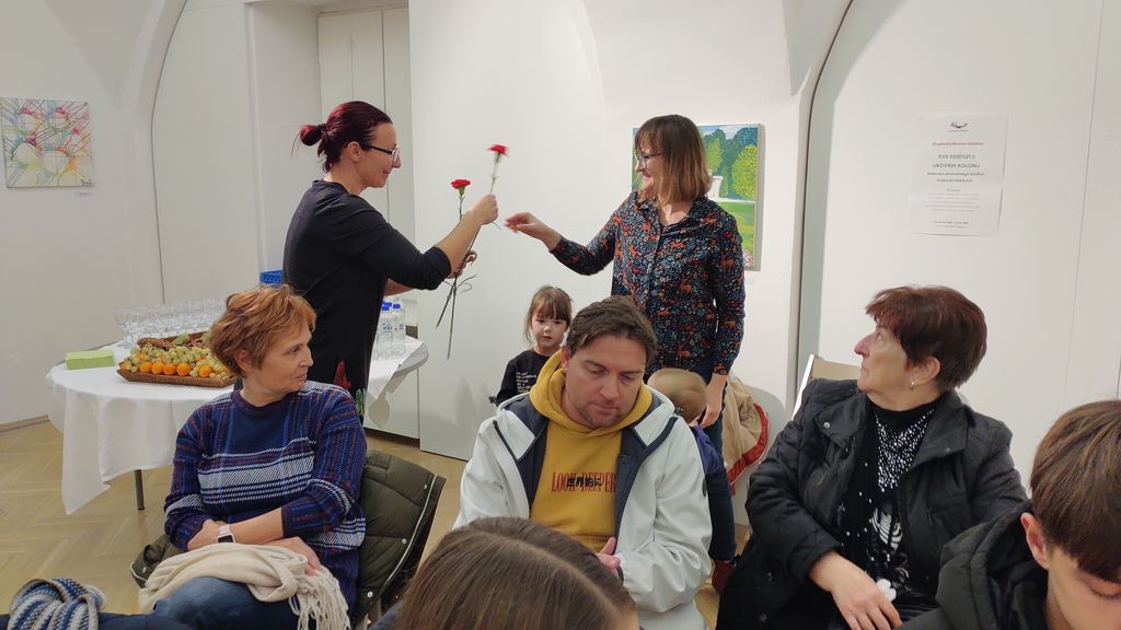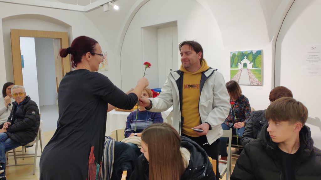 K besedi je bila povabljena še vodja likovne sekcije, Aleksandra Vidovič, ki nas je popeljala v dve desetletji likovnih kolonij DPD Svoboda Kidričevo. Utrinki teh dvajsetih let so krasili stene poročne dvorane dvorca Sternthal. Vsem ustvarjalcem in gostu literarnega večera smo se zahvalili s cvetom.
