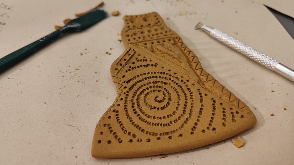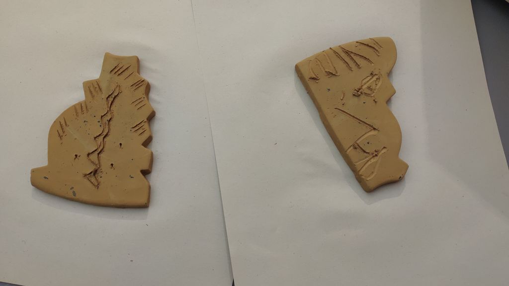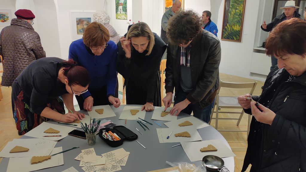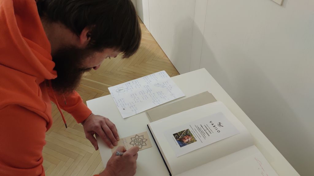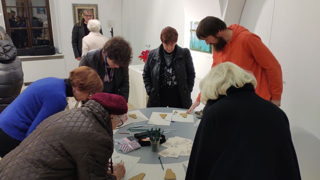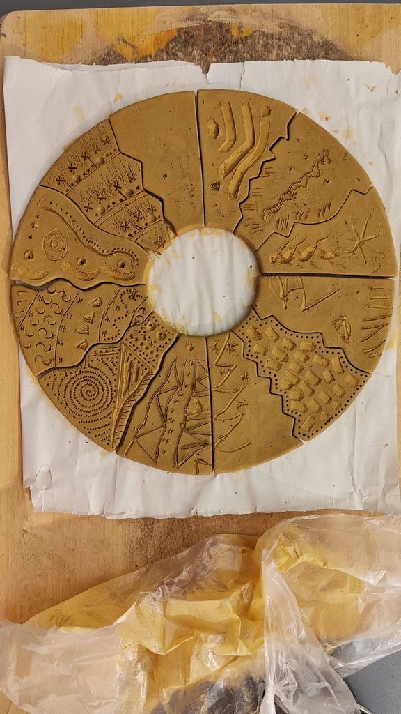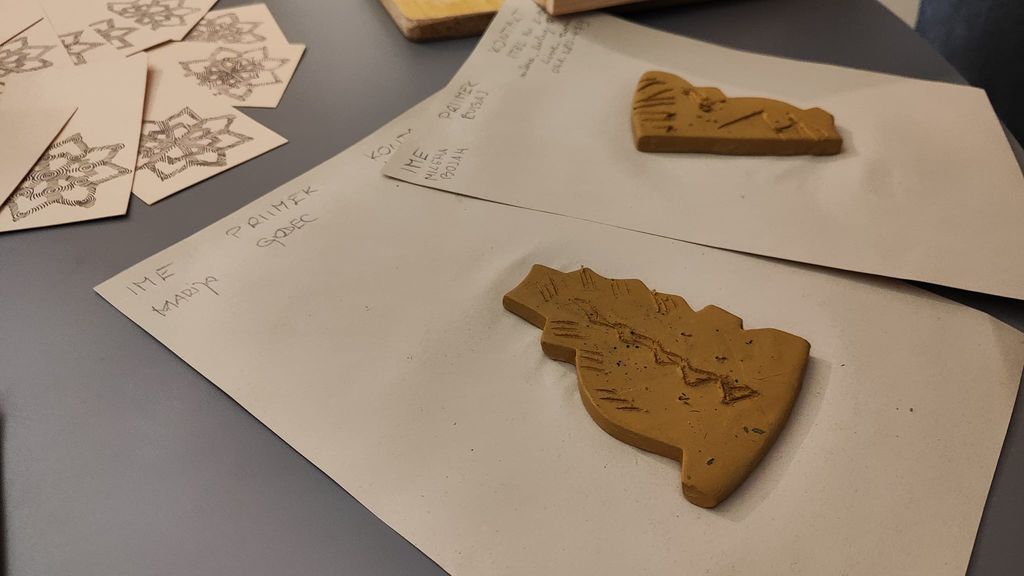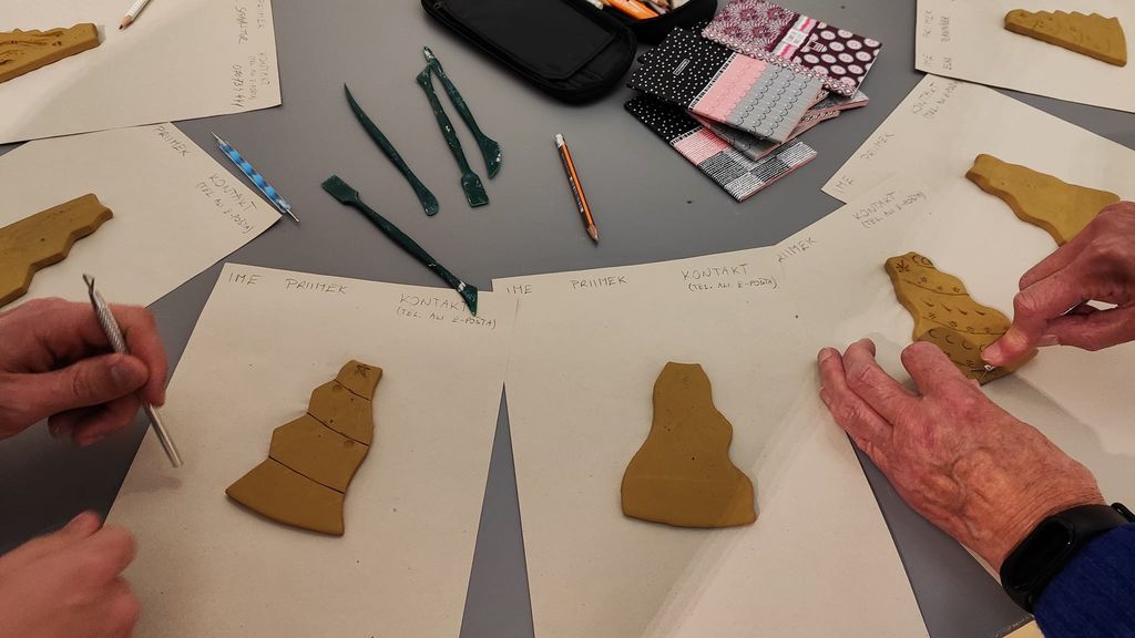 Naš gost pa je za nas pripravil še likovno delavnico, katere smo se lahko vsi udeležili. Pripravil je dvanajst glinenih ploščic, ki skupaj sestavljajo krog. Vsak udeleženec je lahko napisal, narisal ali oddal pečat v glino. Teh dvanajst kosov bo razpršenih na različnih lokacijah v okolici. Po kakšnem letu dni se bodo najditelji in ustvarjalci srečali.