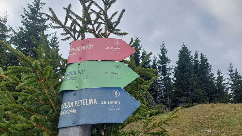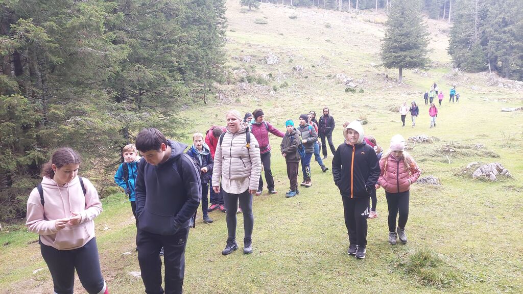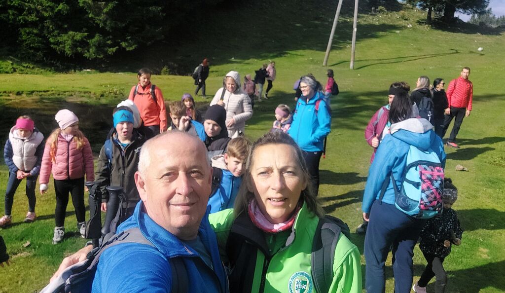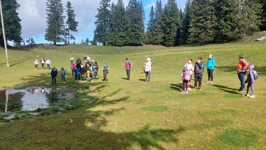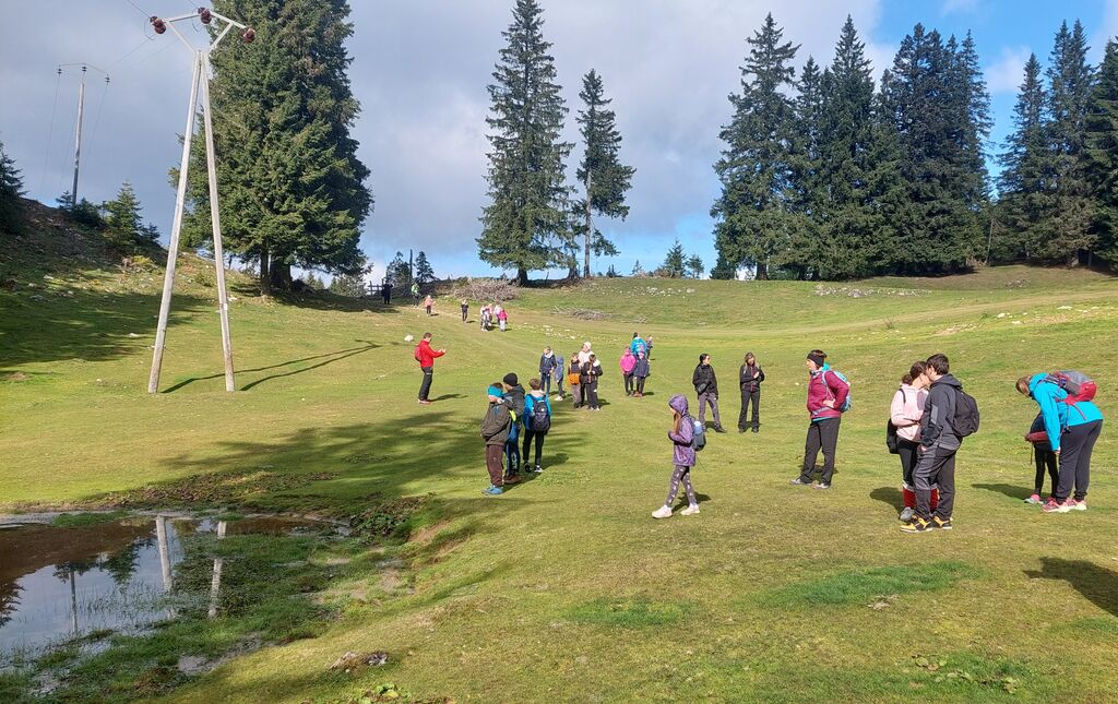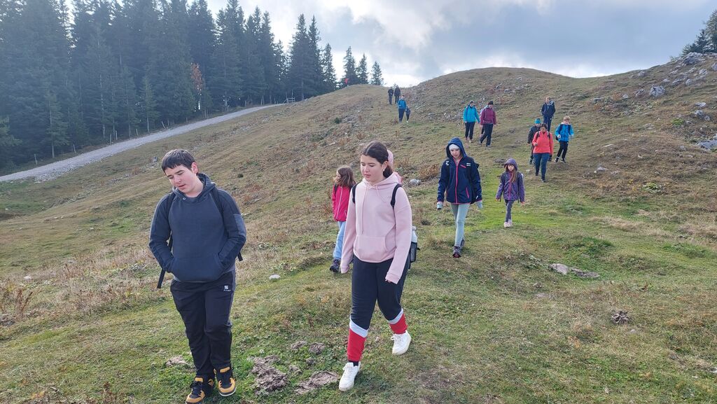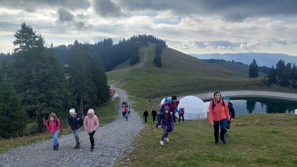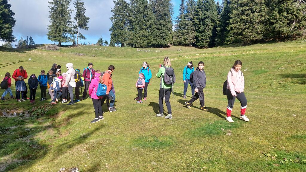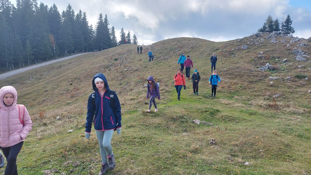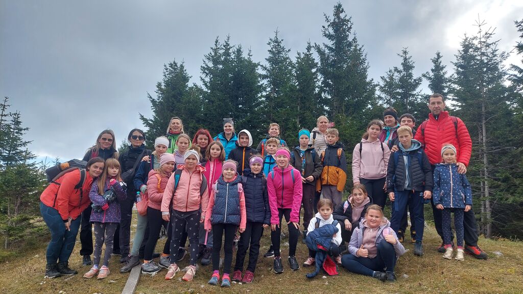 Prvi postanek smo naredili pri hotelu na zgornji postaji žičnice, kjer so se naši najmlajši planinci z veseljem razmigali na otroških igralih. S svežo energijo smo pot nadaljevali proti Medvedjeku, kjer smo si na vrhu ogledali spominsko obeležje in uživali v čudovitih razgledih.