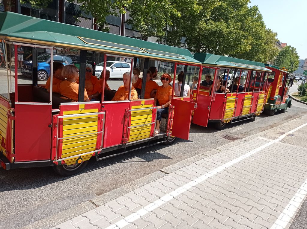 Ob 11. uri smo se otroško razposajene vkrcale na vlakec »Jurček«, ki nas je popeljal po mestnih ulicah, čez Lent ob Dravi, mimo stare trte do Ljudskega vrta in nazaj do Frančiškanske cerkve. Večina naših telovadk je bila zaposlenih v Mariboru, zato so med vožnjo obujale spomine na stare čase v Mariboru.