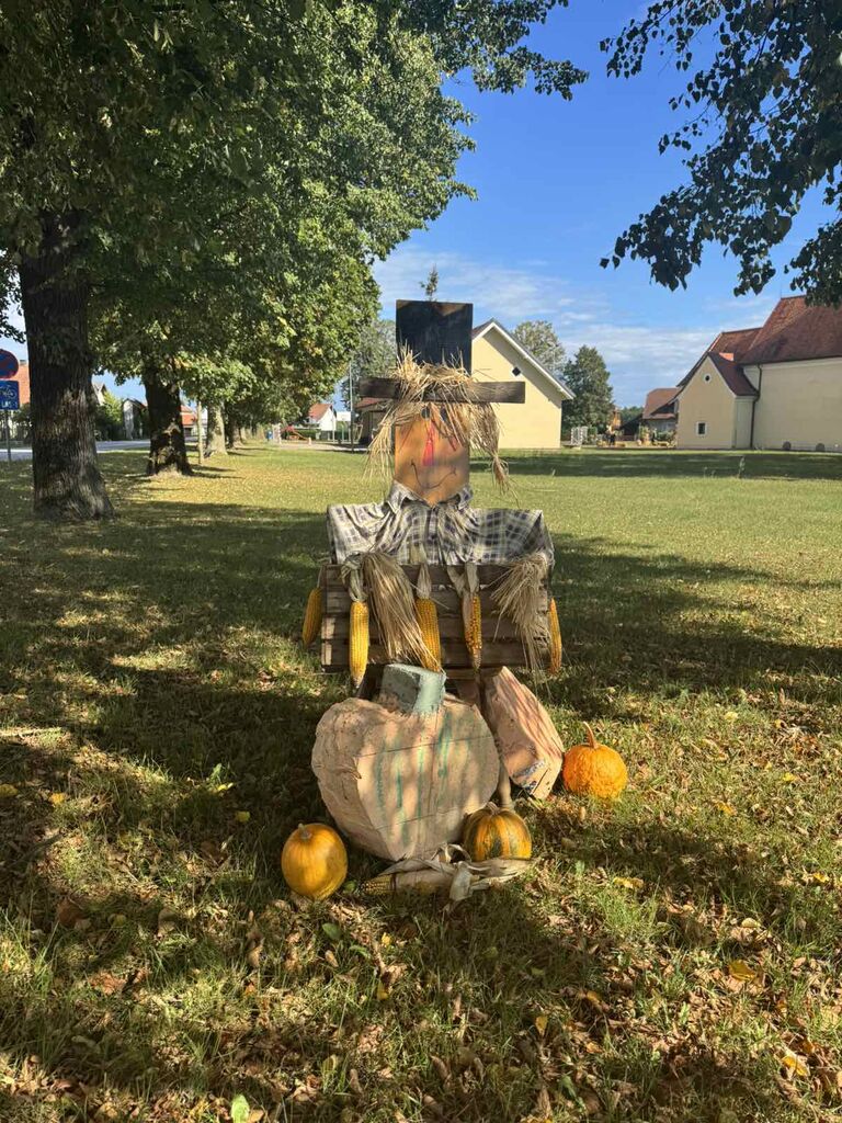 Ker smo bile omejene pri izbiri poljskih pridelkov, smo se napotile tudi v gozd in nabrale nekaj rastlin, ki smo jih uporabile pri okrasitvi, nekaj pa smo jih naredile same s pomočjo različnih barv, lesa in stiropora. Z dobro voljo, vztrajnostjo in iznajdljivostjo nam je uspelo narediti zadano nalogo in nastali so prekrasni izdelki, ki so okrasili naše vaško središče in privabili poglede mimoidočih.