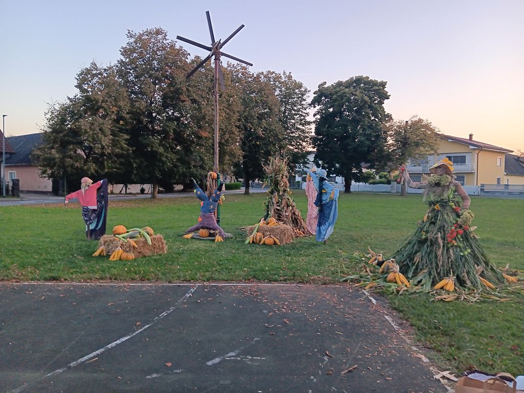 V pozdrav jeseni smo članice Šole zdravja Kungota tudi letos okrasile vaško središče. Tokrat smo za dekoracijo uporabile poljske pridelke, ki smo jih nabrale na polju okrog naših domov. Iz koruze, buč, sončnic in okrasnih trav smo oblikovale tetko Jesen z njenim spremstvom. Postavile smo še nekaj strašil, da je slika bolj pisana. Moški so postavili klopotec, ki bo s svojim klopotanjem preganjal škorce. Izpod spretnih rok jutranjih telovadk so nastale prekrasne kreacije sredi naše gmajne. Z njimi smo navdušile naše otroke, ki se zbirajo na igrišču.