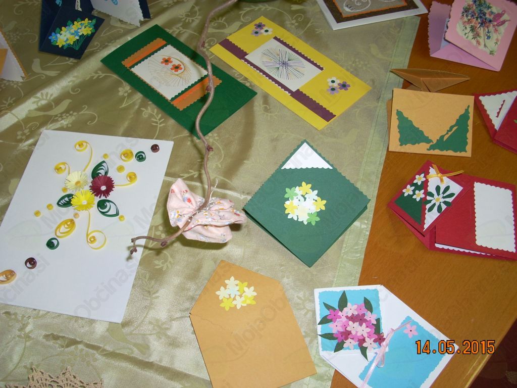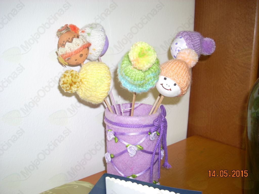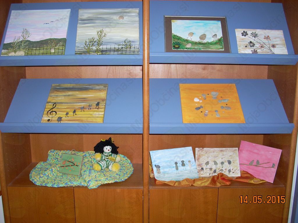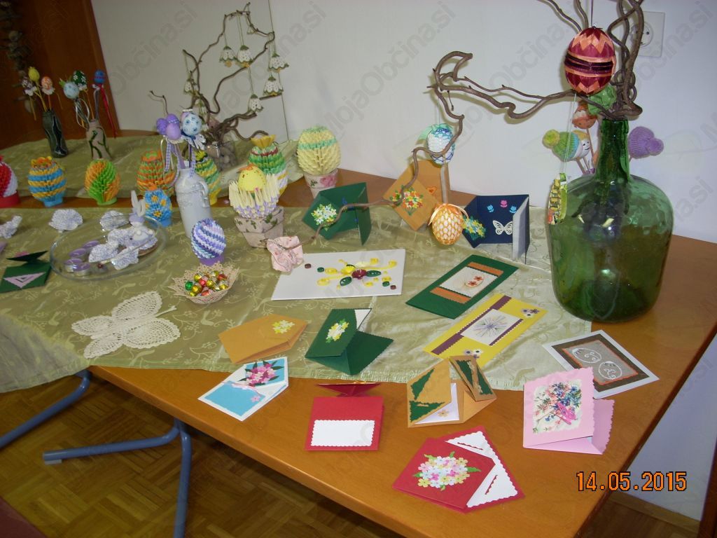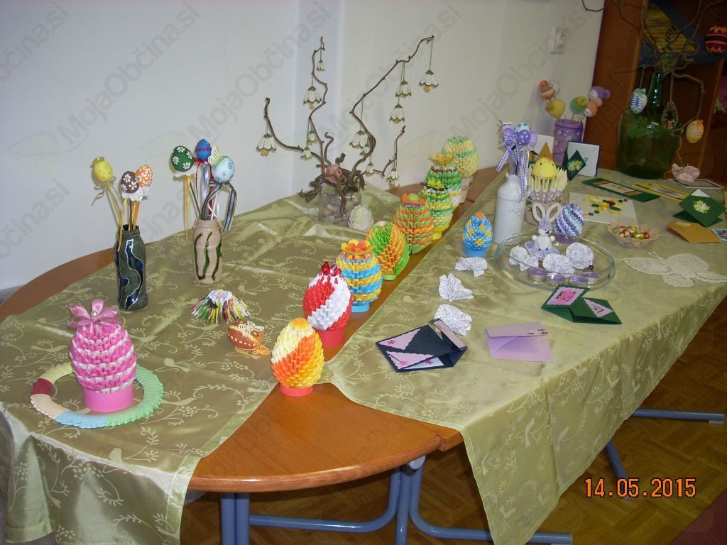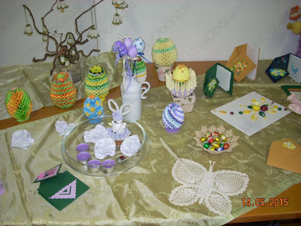 Na policah so razstavljene slike iz kamenčkov na platnu, mize pa so polne velikonočnih jajčk v origami tehniki ter najrazličnejših rož in rožic.