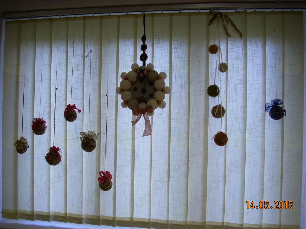 Na mizi pri oknu so razstavljeni kvačkani izdelki. Še zavese so del razstave, na njih so obešeni zlati novoletni obeski in adventni venčki.