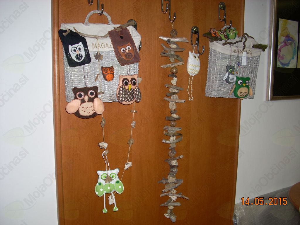 Z obešalnika me gledajo sovice iz blaga in razni leseni okraski.