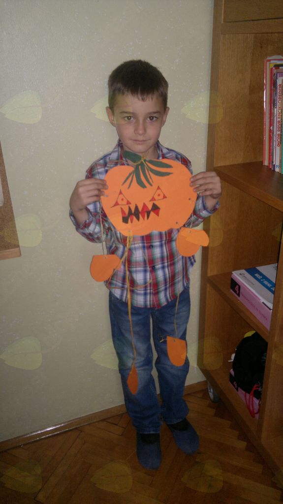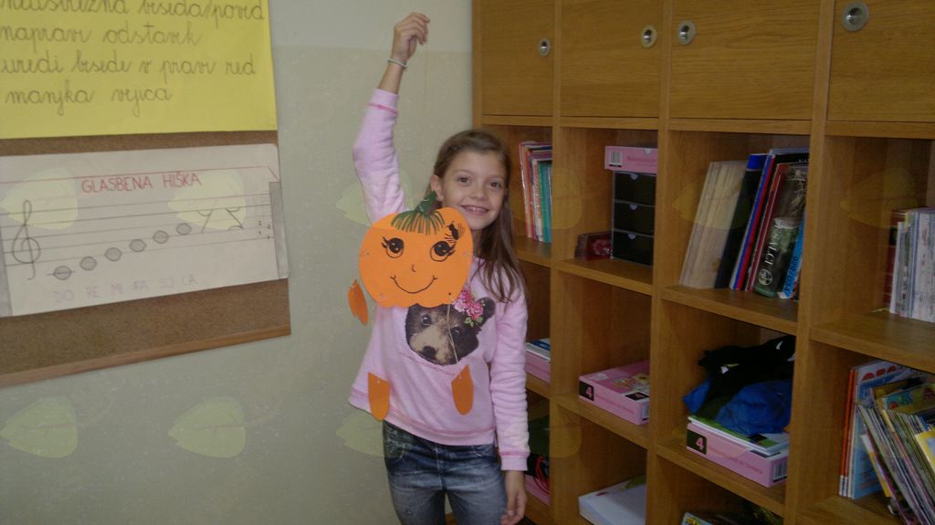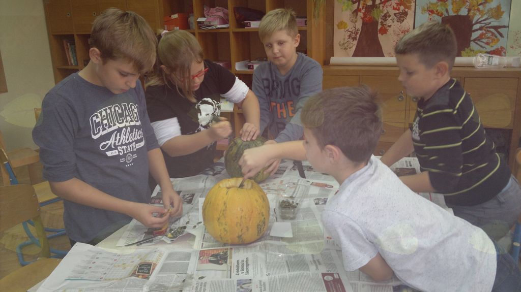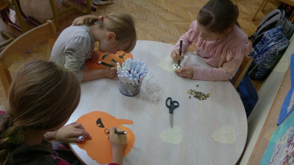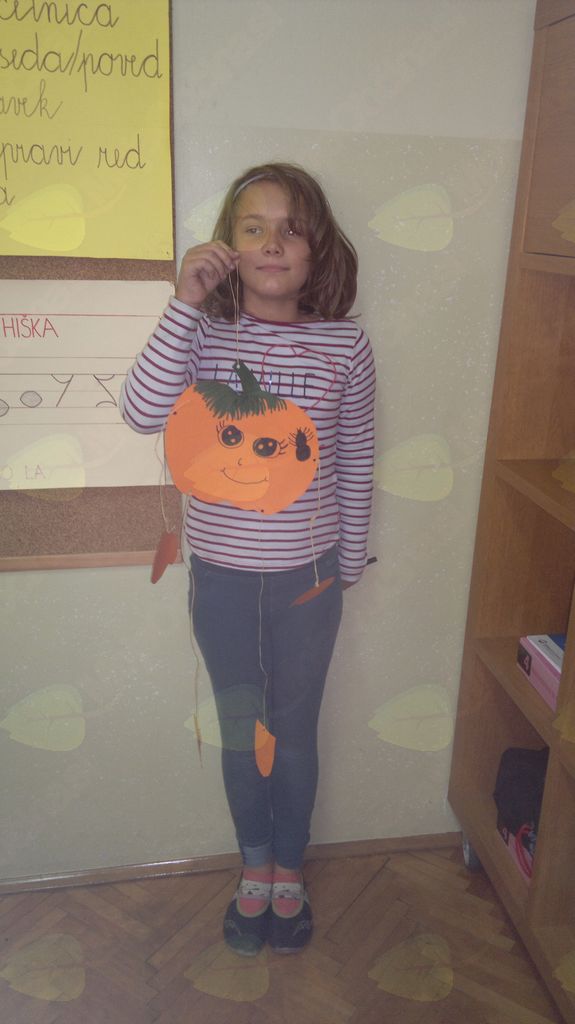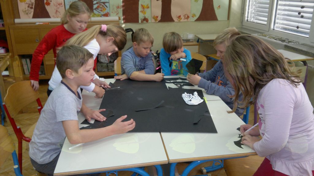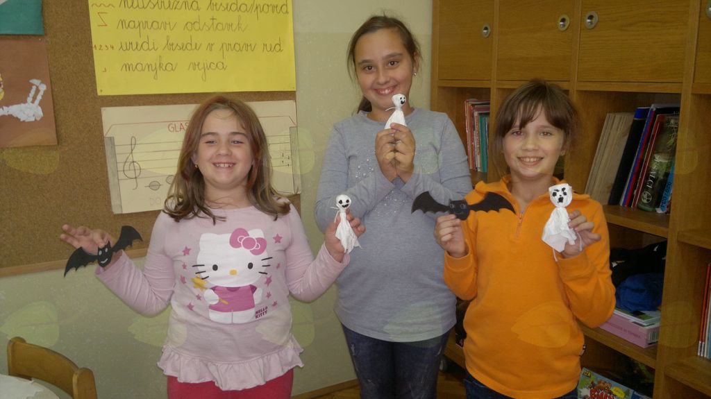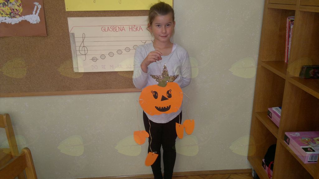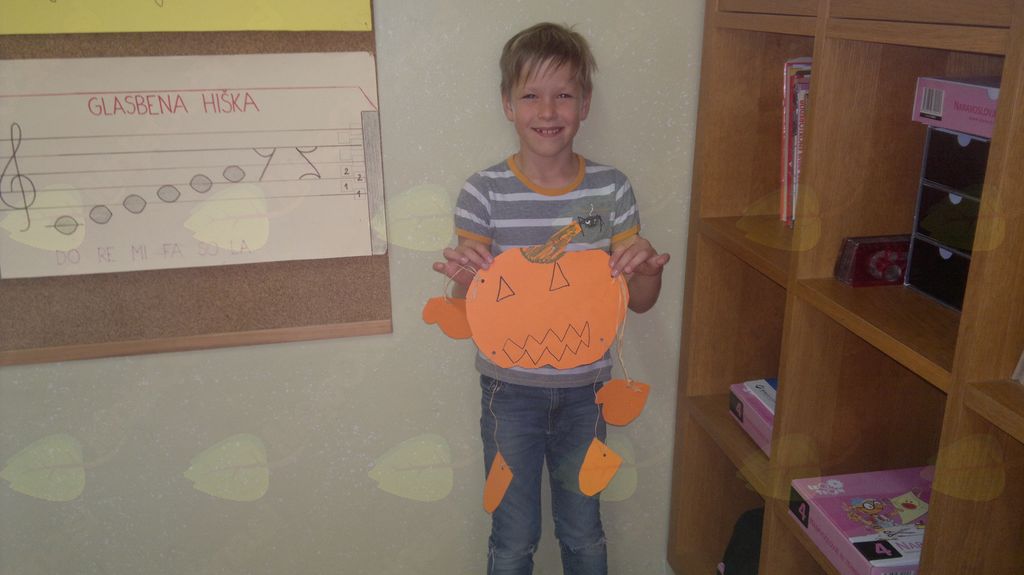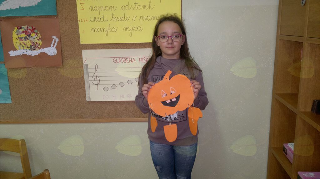 V mesecu oktobru smo se v podaljšanem bivanju v Kidričevem posvetili temi jesen. Na začetku meseca smo slikali na temo vinograd in sadovnjak. Odšli smo v gozd in nabrali storže, palice, kostanje in lubje. Izdelali smo si veliko izdelkov. Začeli smo z mobilom iz visečih storžev, na travniku smo pridno nabirali liste in si izdelali gozdne vile, lubje smo odeli v raznobarvne vzorce s pomočjo tempera barv. Proti koncu meseca, ko se je bližala noč čarovnic, si je vsak učenec izdelal netopirja, duhca in bučo iz papirja. Najbolj smo bili navdušeni nad pravo poljsko bučo, saj smo jo spremenili v laterno in pri tem neznansko uživali. Sami smo jo izrezali in strebili. Semena smo sušili na okenski polici in jih z užitkom poskusili. Pri vseh opravilih smo se zelo zabavali.