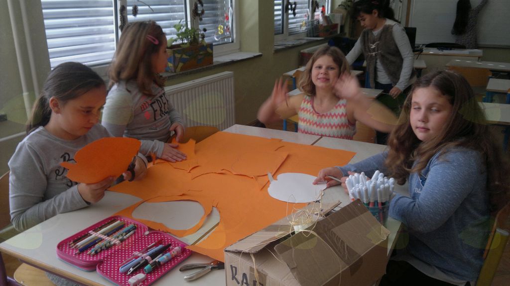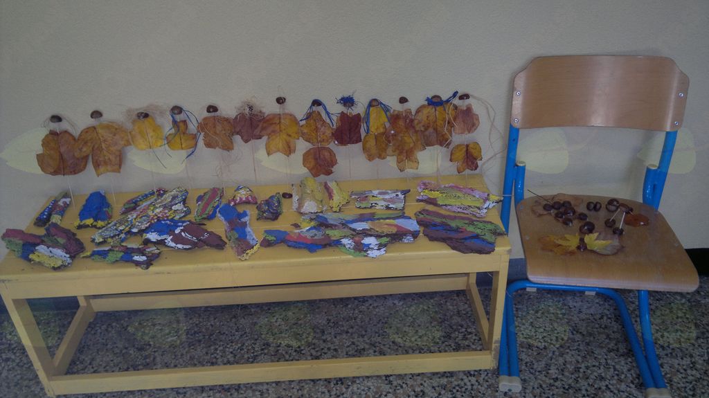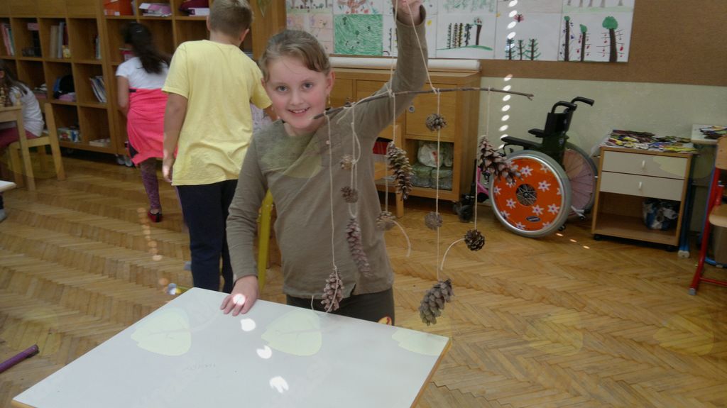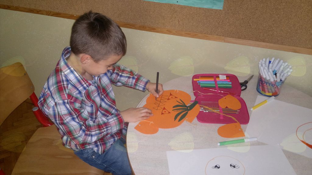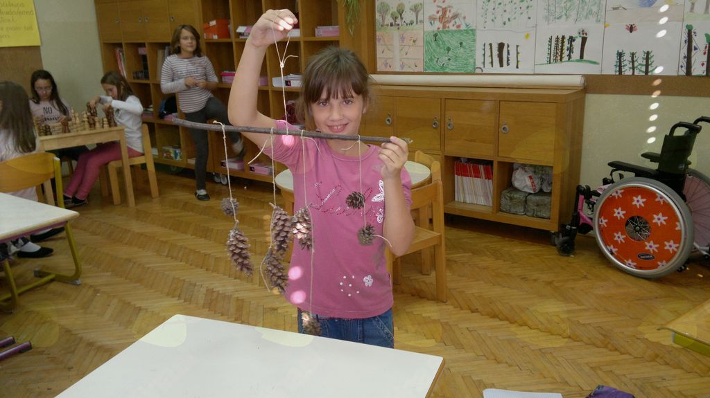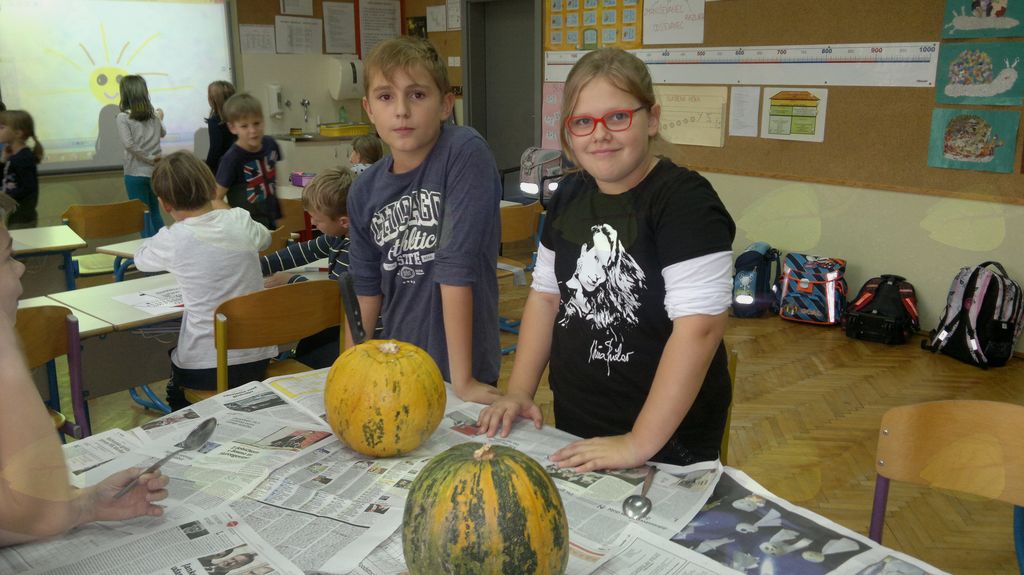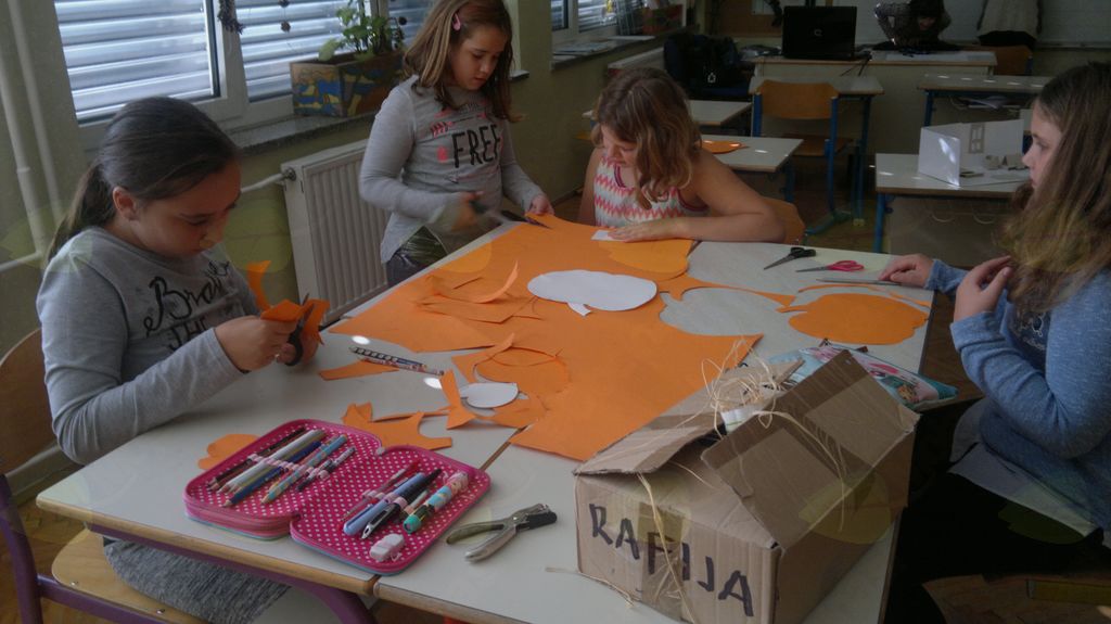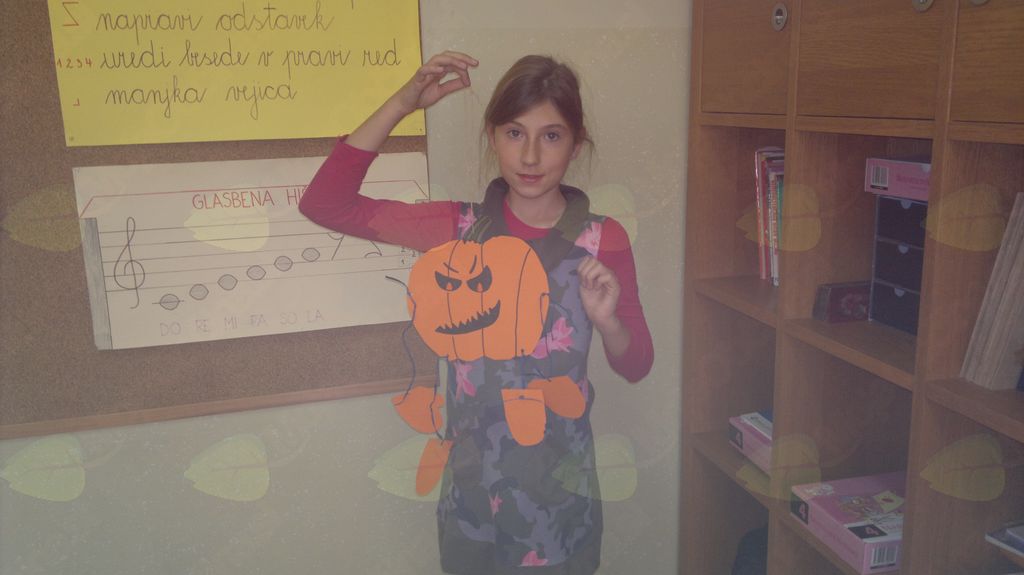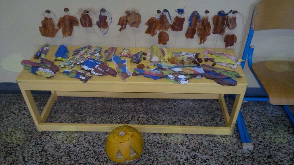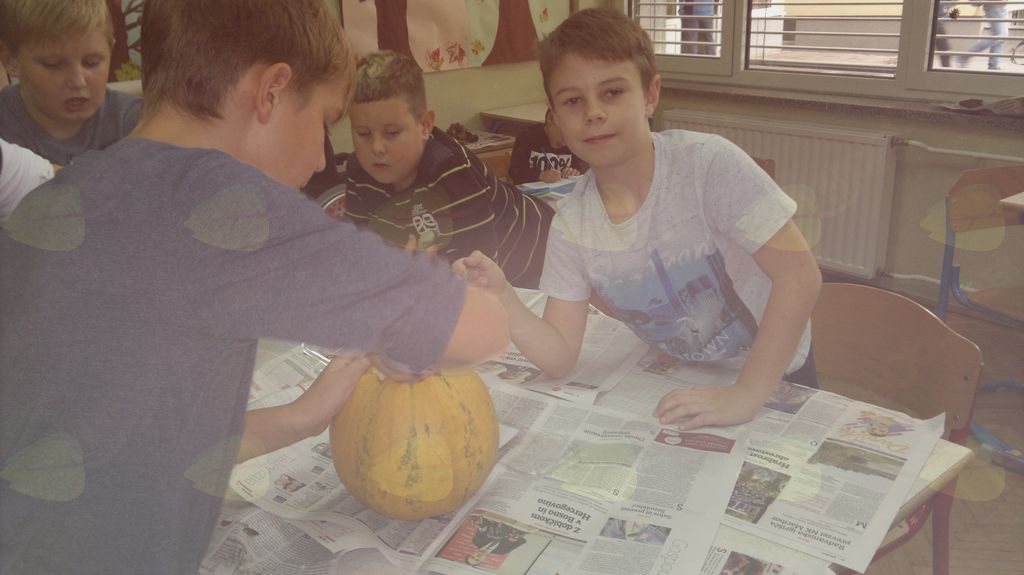 V mesecu oktobru smo se v podaljšanem bivanju v Kidričevem posvetili temi jesen. Na začetku meseca smo slikali na temo vinograd in sadovnjak. Odšli smo v gozd in nabrali storže, palice, kostanje in lubje. Izdelali smo si veliko izdelkov. Začeli smo z mobilom iz visečih storžev, na travniku smo pridno nabirali liste in si izdelali gozdne vile, lubje smo odeli v raznobarvne vzorce s pomočjo tempera barv. Proti koncu meseca, ko se je bližala noč čarovnic, si je vsak učenec izdelal netopirja, duhca in bučo iz papirja. Najbolj smo bili navdušeni nad pravo poljsko bučo, saj smo jo spremenili v laterno in pri tem neznansko uživali. Sami smo jo izrezali in strebili. Semena smo sušili na okenski polici in jih z užitkom poskusili. Pri vseh opravilih smo se zelo zabavali.