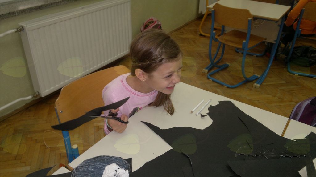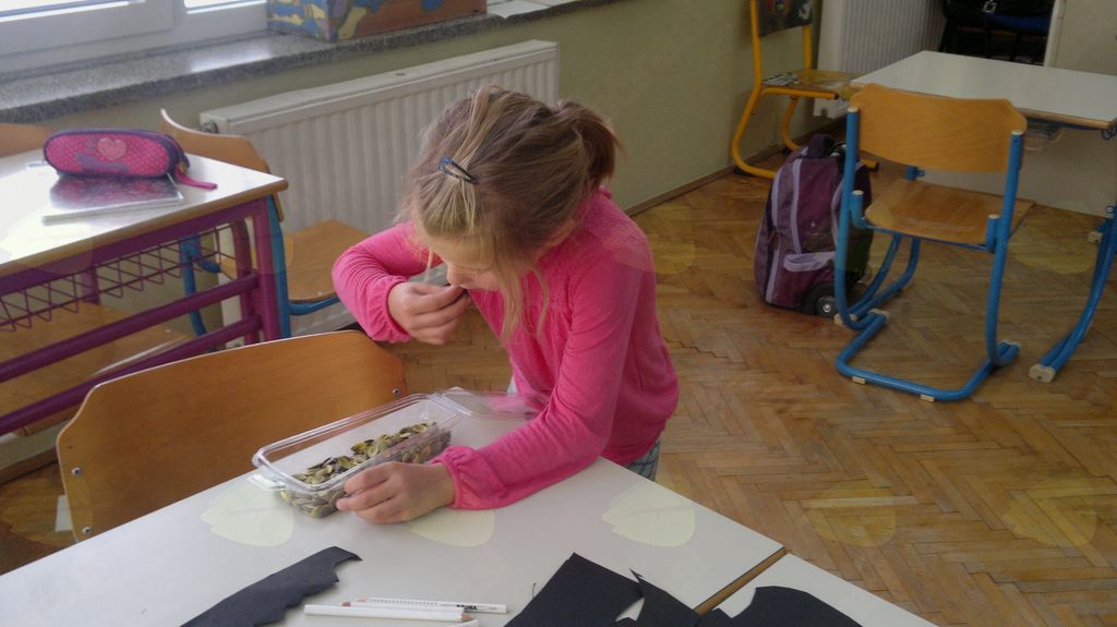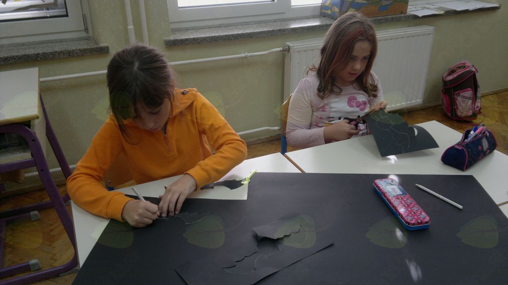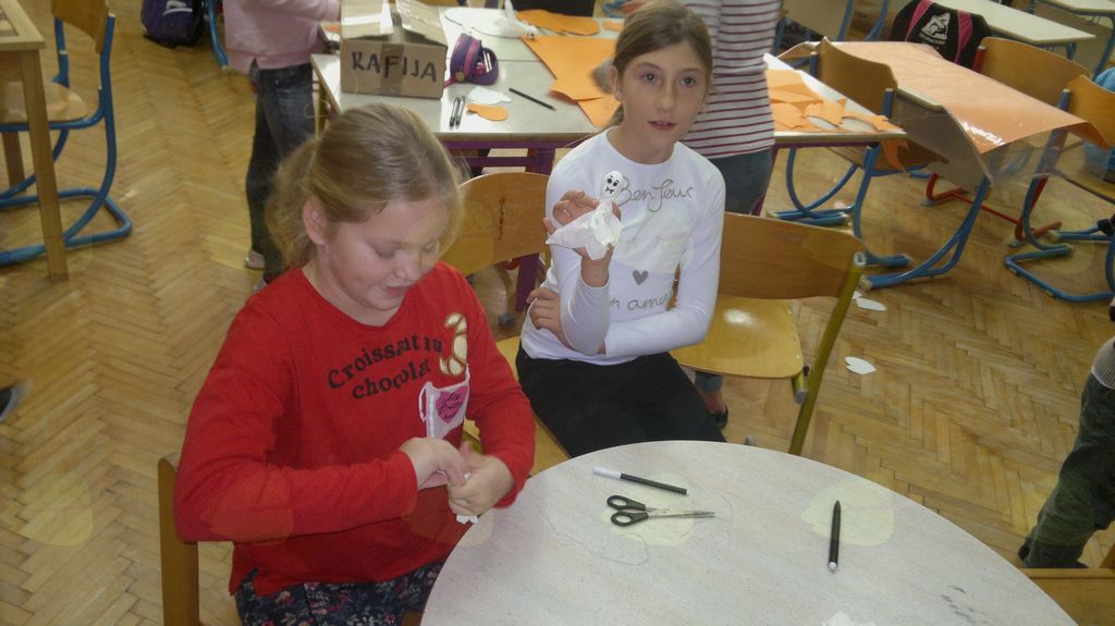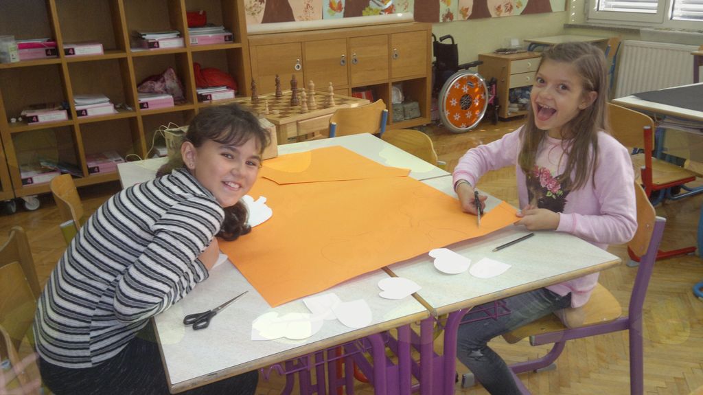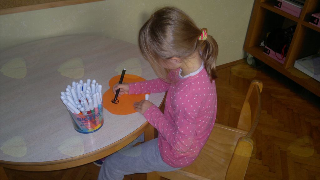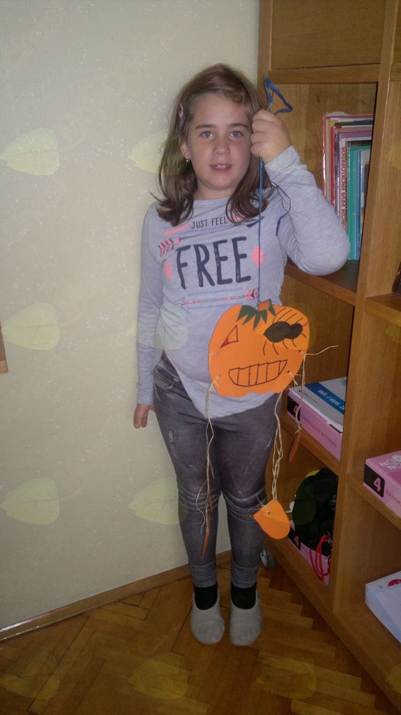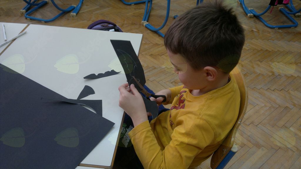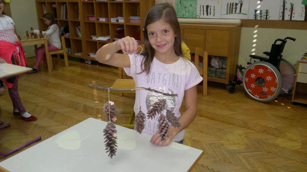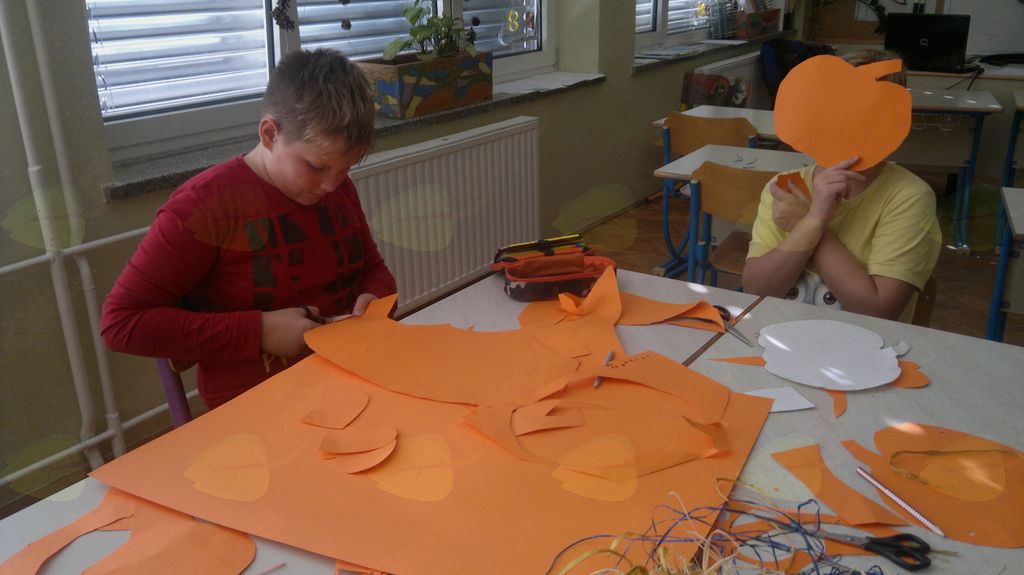 V mesecu oktobru smo se v podaljšanem bivanju v Kidričevem posvetili temi jesen. Na začetku meseca smo slikali na temo vinograd in sadovnjak. Odšli smo v gozd in nabrali storže, palice, kostanje in lubje. Izdelali smo si veliko izdelkov. Začeli smo z mobilom iz visečih storžev, na travniku smo pridno nabirali liste in si izdelali gozdne vile, lubje smo odeli v raznobarvne vzorce s pomočjo tempera barv. Proti koncu meseca, ko se je bližala noč čarovnic, si je vsak učenec izdelal netopirja, duhca in bučo iz papirja. Najbolj smo bili navdušeni nad pravo poljsko bučo, saj smo jo spremenili v laterno in pri tem neznansko uživali. Sami smo jo izrezali in strebili. Semena smo sušili na okenski polici in jih z užitkom poskusili. Pri vseh opravilih smo se zelo zabavali.