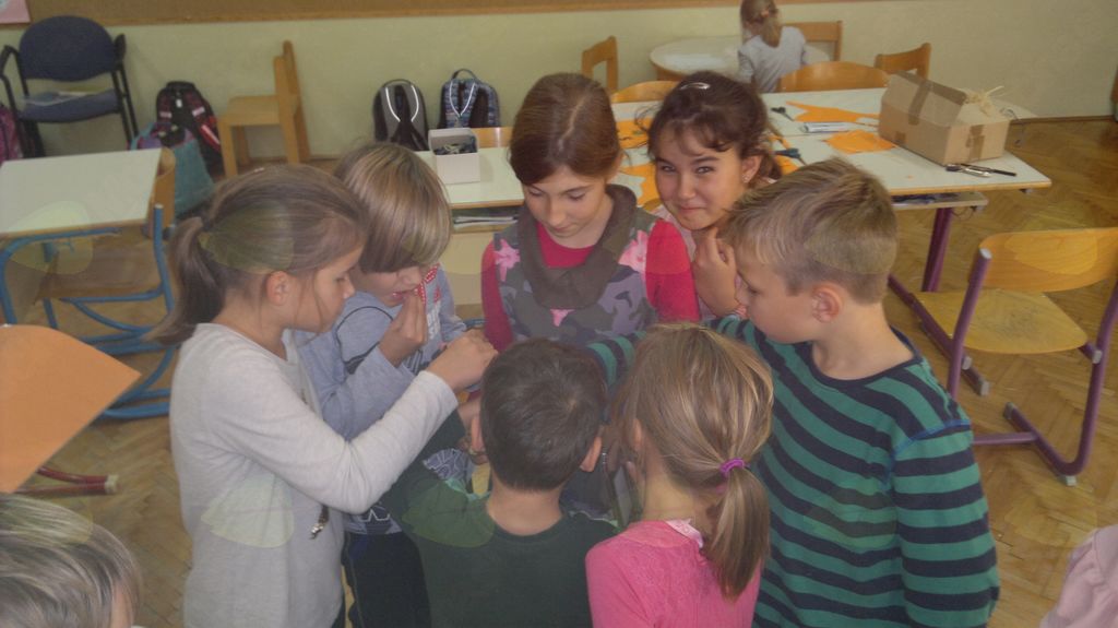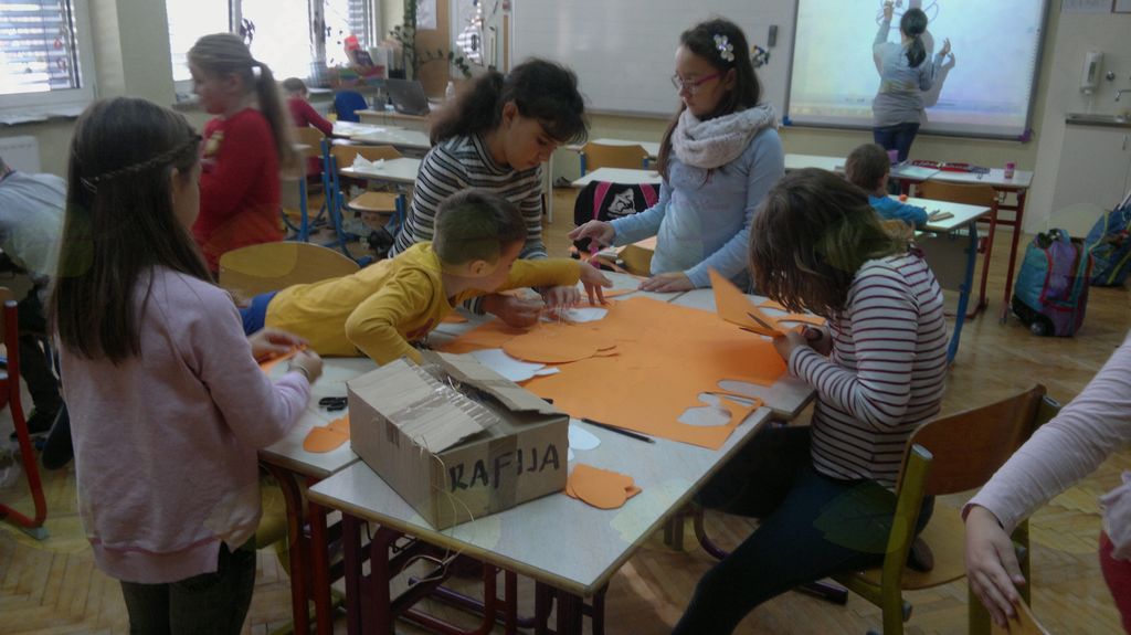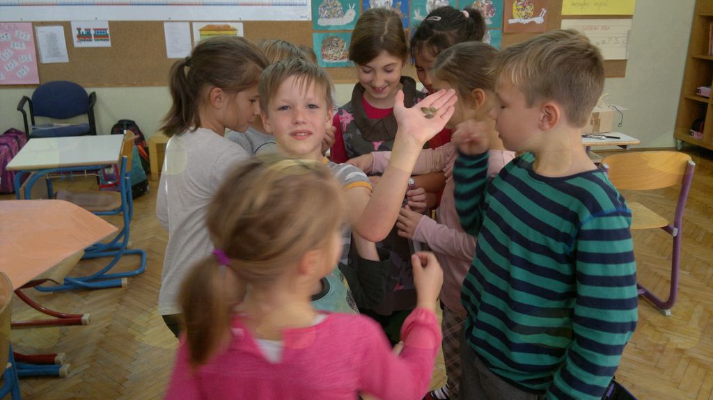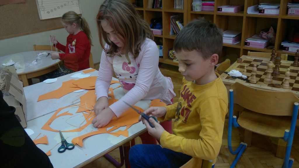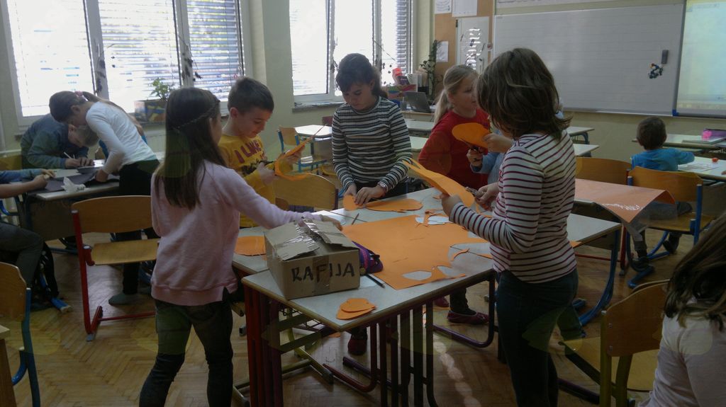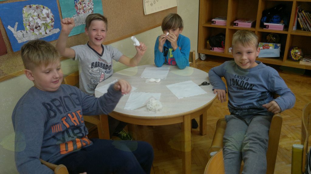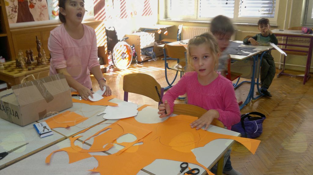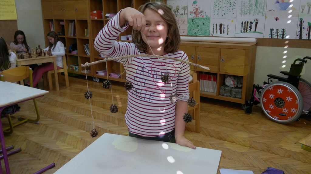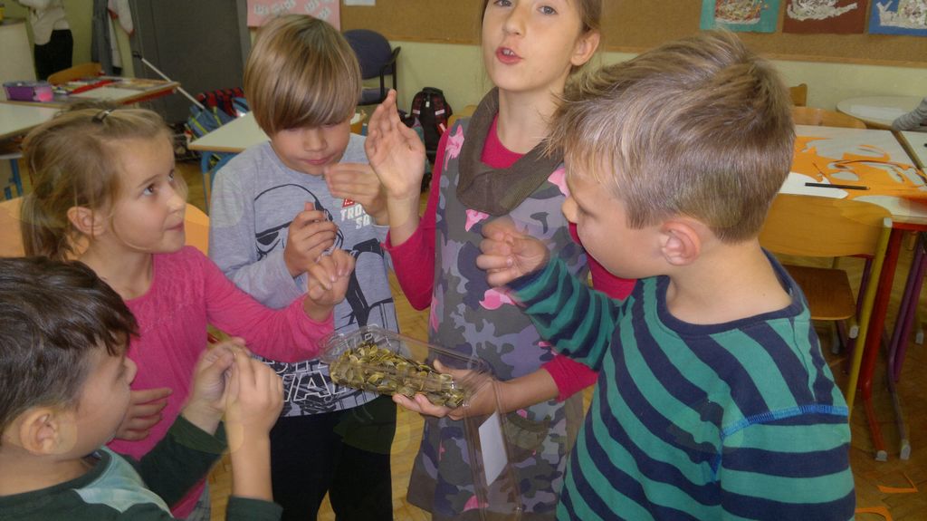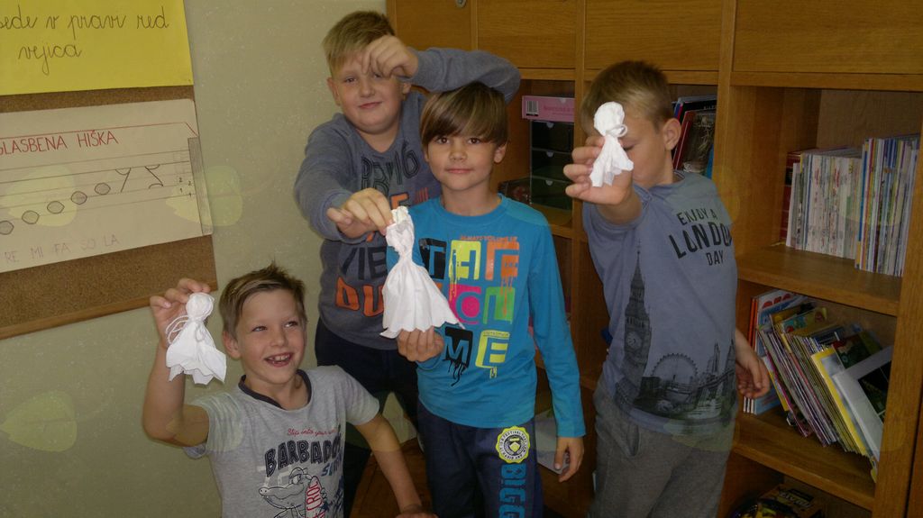 V mesecu oktobru smo se v podaljšanem bivanju v Kidričevem posvetili temi jesen. Na začetku meseca smo slikali na temo vinograd in sadovnjak. Odšli smo v gozd in nabrali storže, palice, kostanje in lubje. Izdelali smo si veliko izdelkov. Začeli smo z mobilom iz visečih storžev, na travniku smo pridno nabirali liste in si izdelali gozdne vile, lubje smo odeli v raznobarvne vzorce s pomočjo tempera barv. Proti koncu meseca, ko se je bližala noč čarovnic, si je vsak učenec izdelal netopirja, duhca in bučo iz papirja. Najbolj smo bili navdušeni nad pravo poljsko bučo, saj smo jo spremenili v laterno in pri tem neznansko uživali. Sami smo jo izrezali in strebili. Semena smo sušili na okenski polici in jih z užitkom poskusili. Pri vseh opravilih smo se zelo zabavali.