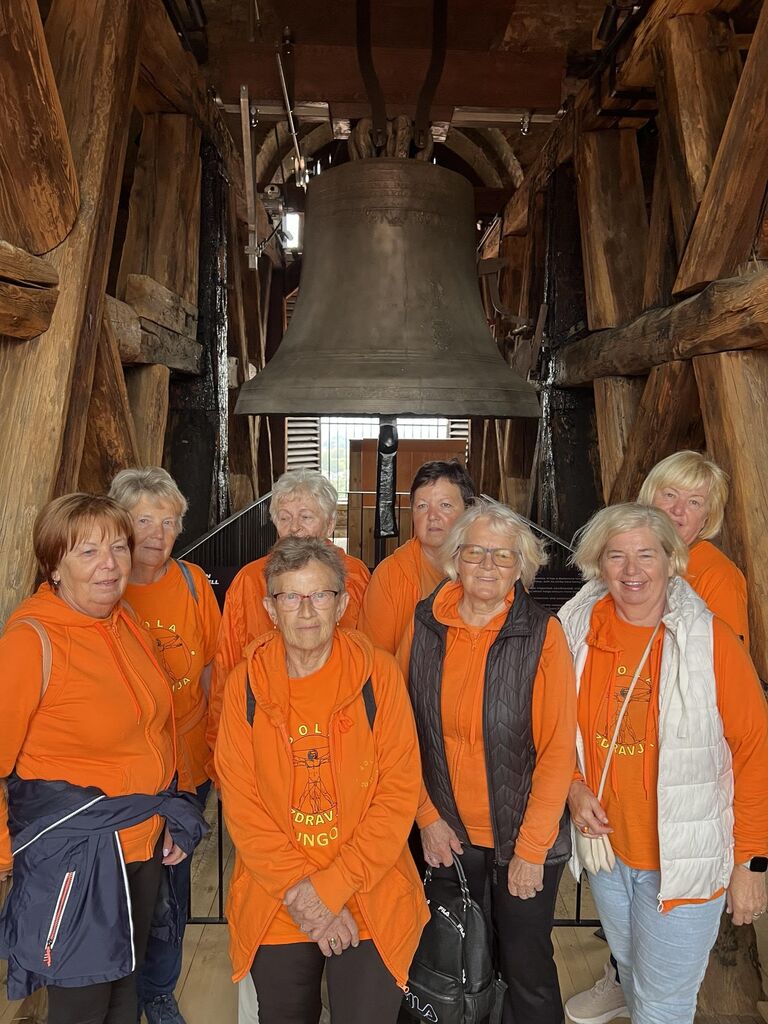 Ker smo v naši skupini pred dnevi obeležile deveto obletnico jutranje telovadbe, smo se odločile, da jo na ta dan tudi proslavimo. Sprehodile smo se po našem najstarejšem mestu in si ogledale znamenitosti. Pot nas je pripeljala do stolpa, ki stoji ob Jurijevi cerkvi in se je pred nekaj časa odprl za ogled. Odločile smo se, da si ga ogledamo. Po ozkih in strmih stopnicah smo se počasi vzpenjale in občudovale široke zidove, nihalo in uteži stare ure ter največji zvon. Na vrhu se nam je odprl čudovit razgled na celo mesto in na bližnjo okolico. Kar nekaj časa smo se zadržale na vrhu, kjer smo se ob velikem zvonu tudi slikale. Nato smo se počasi in previdno spuščale navzdol, med potjo pa smo si ogledale tudi video, v katerem so prikazani zgodovinski dogodki, ki so vplivali na nastanek in obnovo tega stolpa, ki je hkrati tudi zvonik, čeprav stoji ločeno od cerkve. Tako smo spoznale še eno znamenitost Ptuja in naše praznovanje obogatile z novim doživetjem. Za konec smo se odpravile na malico in klepet.
