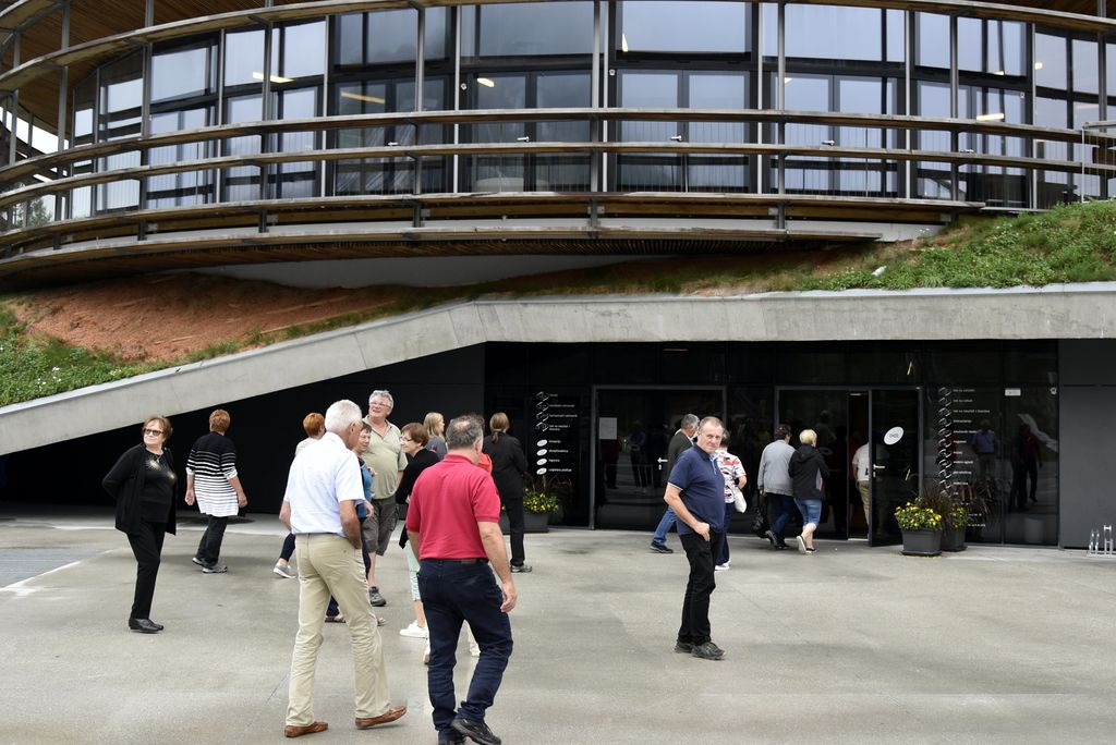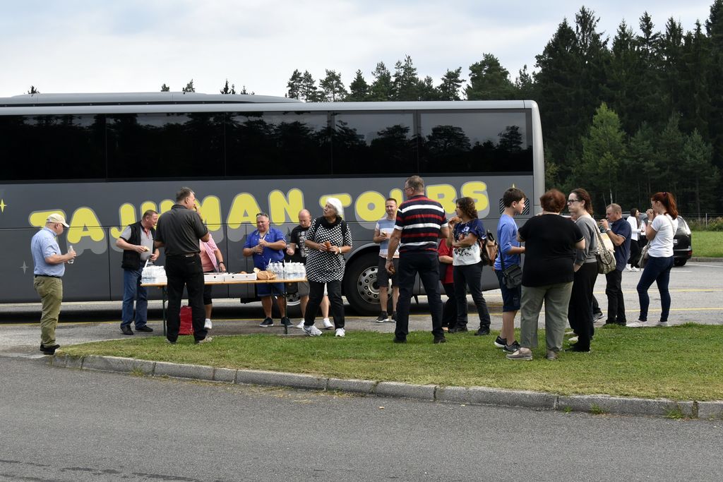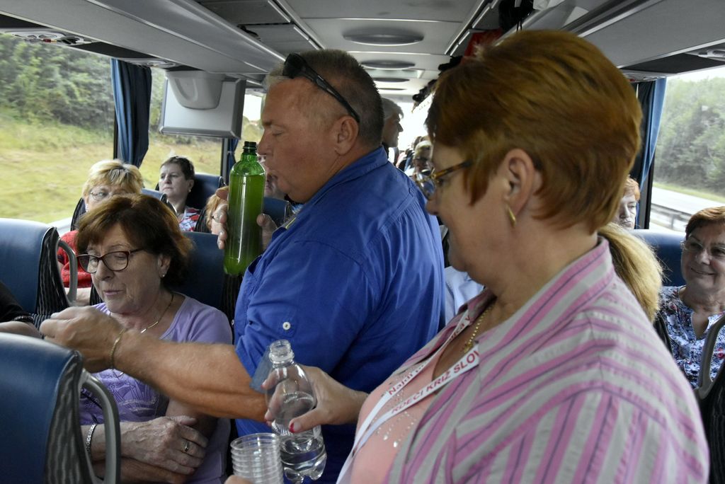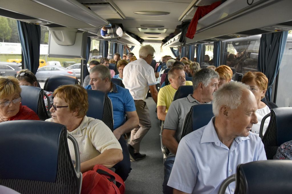 Sobota, ki smo jo načrtovali že marca, je le prišla. Družba, ki nam je narekovala velikost avtobusa vse do zadnjega tedna (59 sedežev), se je namestila na avtobus. Kljub slabi napovedi vremena ni manjkal nihče. Tokrat smo se še posebej razveselili številčnejše udeležbe starejših članov RK. Mladost so zastopali krvodajalci, tako je bila družba uravnotežena že na začetku poti. Na pot sta nas popeljala dva voznika, pred Celjem pa se nam je pridružila še vodička Alenka. Spomnili smo se je iz prejšnjih izletov po njenem nezmotljivem spominu imen potnikov in celo po sedežnem redu.