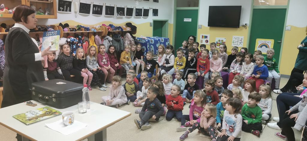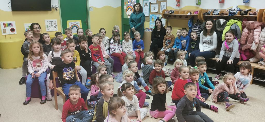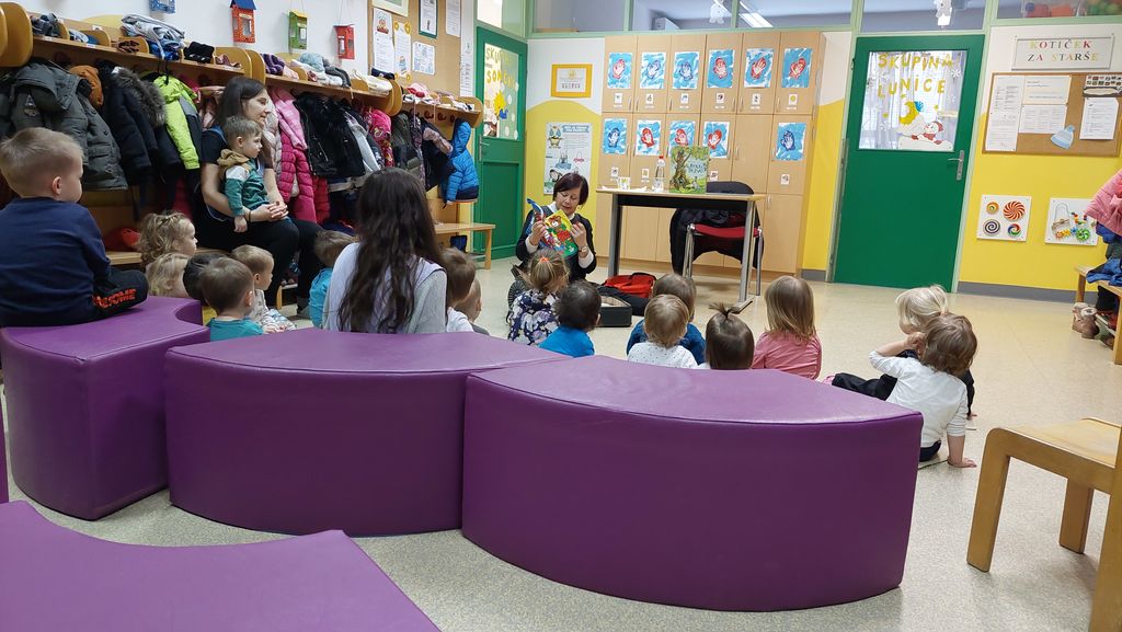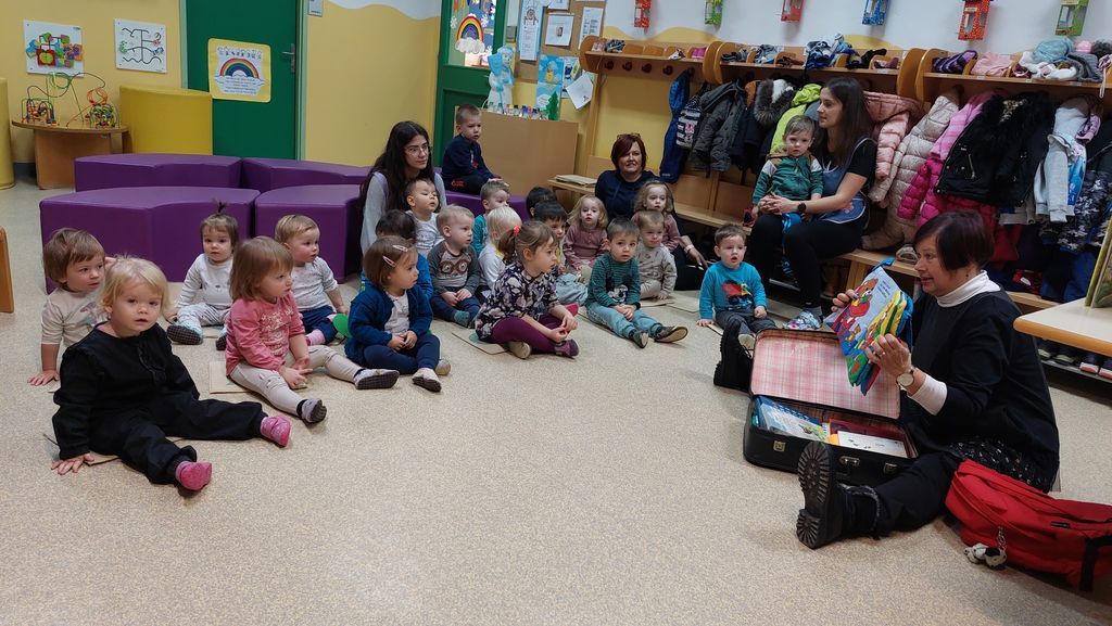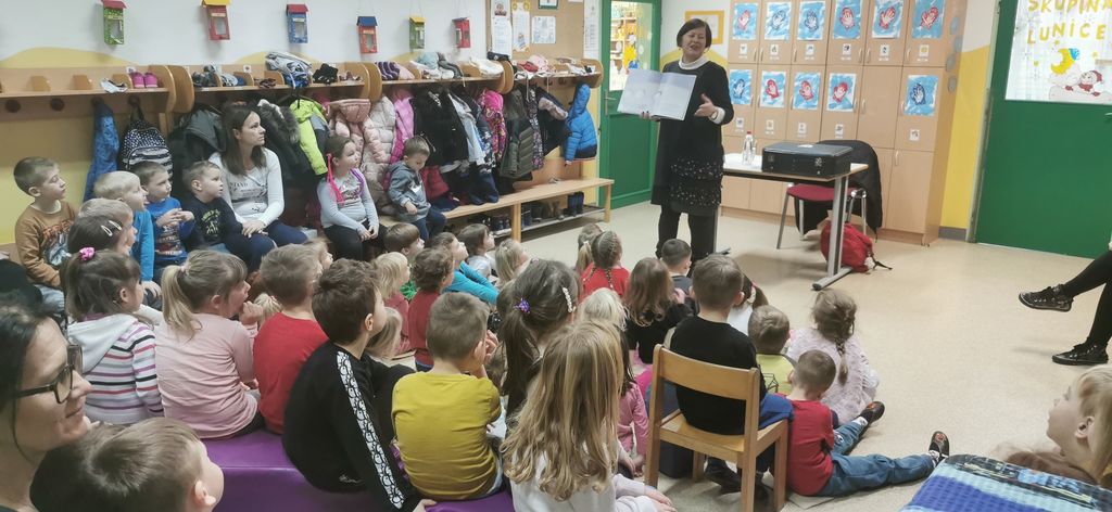 V sklopu tedna kulture in 8. februarja smo v vrtec povabili tudi knjižničarko iz ptujske knjižnice. Knjižničarka Liljana Klemenčič se je prijazno odzvala na naše povabilo in pripravila pravljične minutke za otroke prvega starostnega obdobja in nato še pravljično urico za otroke drugega starostnega obdobja. Mlajšim otrokom je s pomočjo knjig predstavila različne zvoke živali in glasbil. Pokazala jim je knjige z različno trdimi platnicami in oblikami, nato pa smo se še malo razgibali in poimenovali različne predmete ter živali, ki so bili v knjigi. Starejšim trem skupinam otrok je pripovedovala pravljici Sneženi mož in Prelepa, za konec pa jim je recitirala pesem o pustu. Otroci so se seznanili s knjigami iz različnih materialov ter z različnimi vidnimi in slušnimi efekti.
