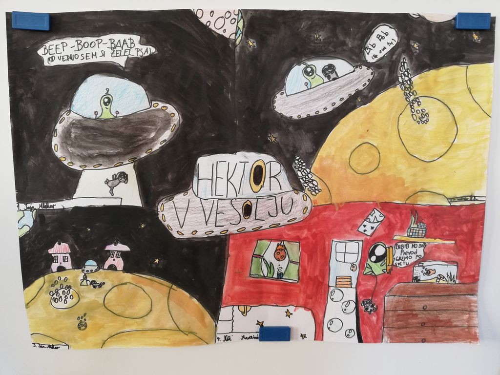 Skupina učencev, ki je brala Hektorja (D. Zupan), je izdelala strip s svojo zgodbo o psu Hektorju, ki je poletel v vesolje.
