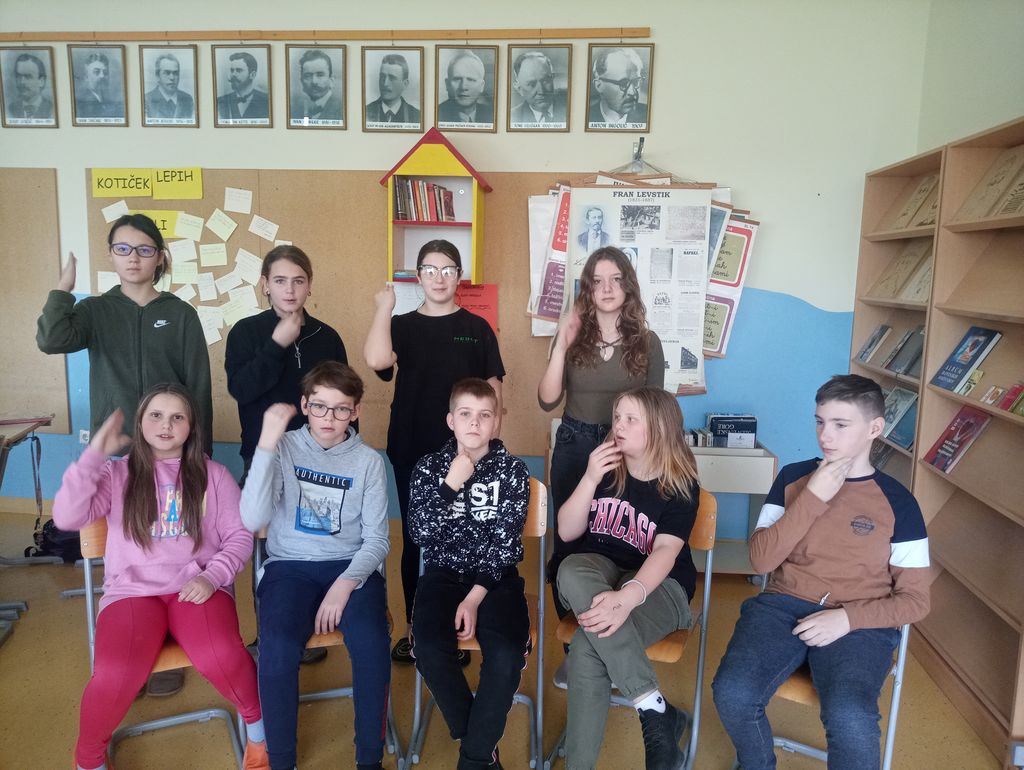 Ob tem dnevu smo s šestošolci razmišljali o tem, kako je tistim, ki svojega maternega jezika ne slišijo in zato uporabljajo znakovni jezik. To, kar so v slovenskem jeziku besede, so za znakovni jezik kretnje. Namesto glasu in izgovorjenih besed uporabljajo za izražanje najrazličnejših vsebin roke, telo, obraz, usta in glavo. Namesto sluha, s katerim sprejemamo besede, gluhi uporabljajo vid, s katerim sprejemajo kretnje.