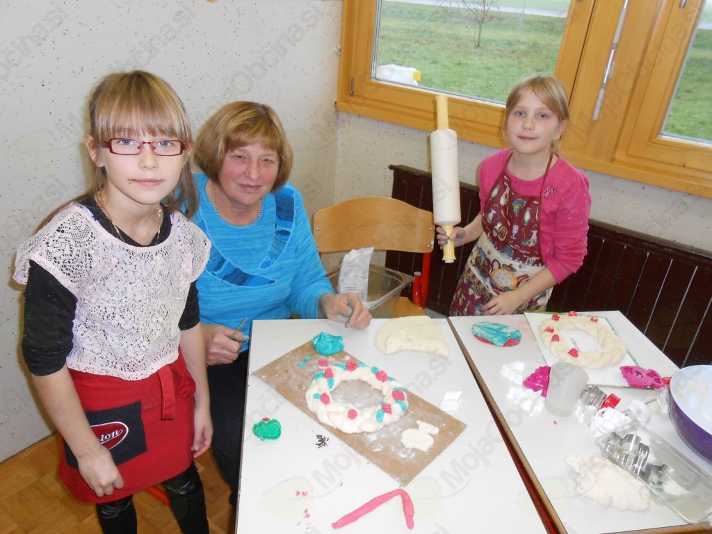 Z babico sva najprej izdelali aluminijaste izdelke, ki so nama delali precej težav, saj se po navodilih ne znam najbolje orientirati. Hitro smo postali lačni, zato nam je gospa Anka, gospodinja šole, prinesla v razred malico. Nam, učencem, je prinesla čokoladne parklje, babicam pa je gospa učiteljica raznosila pecivo. Mi smo jim prinesli sok ali kavo in mleko.