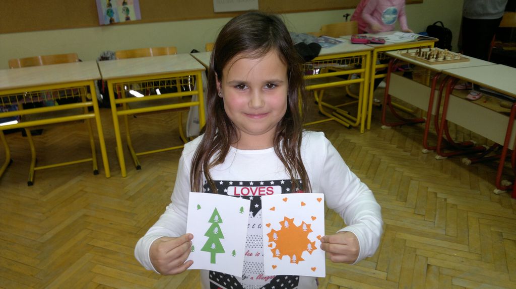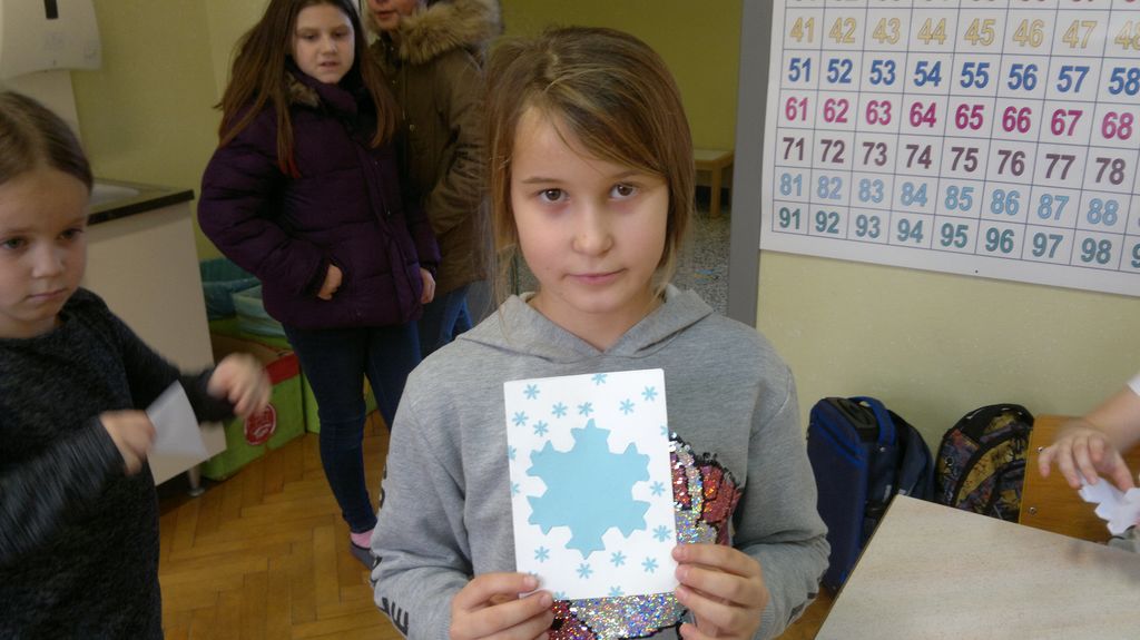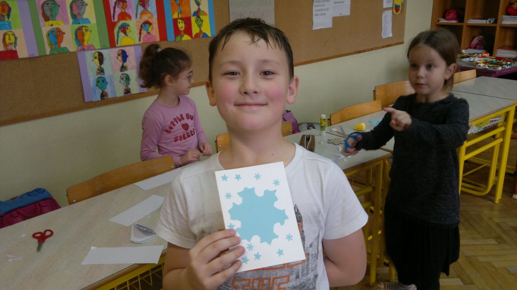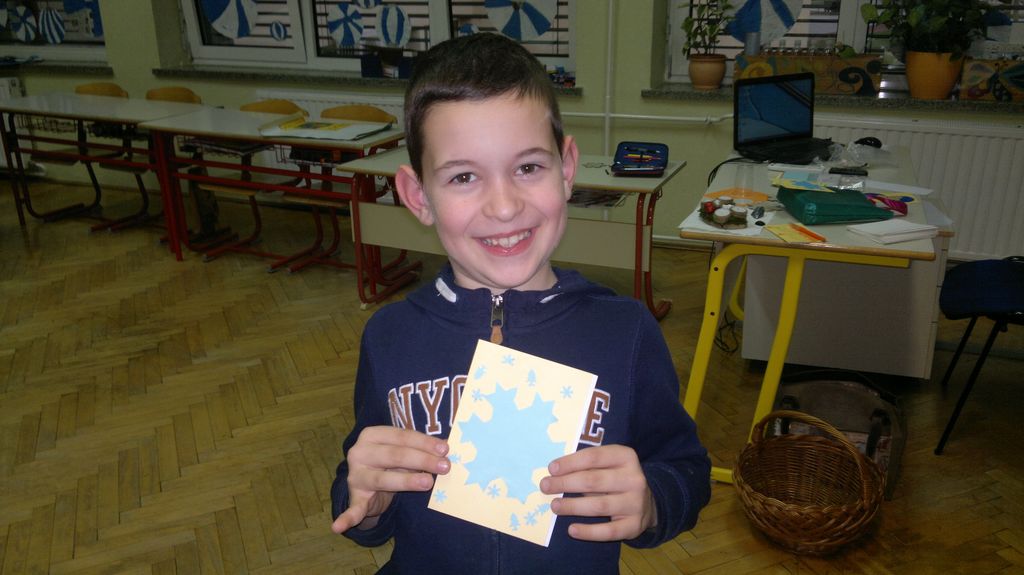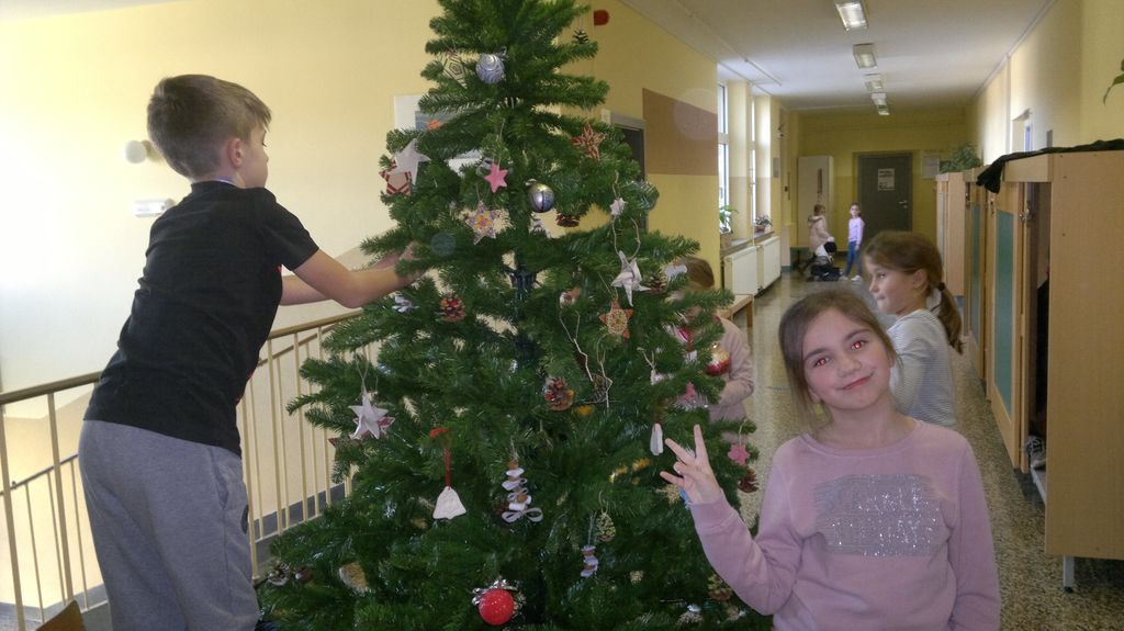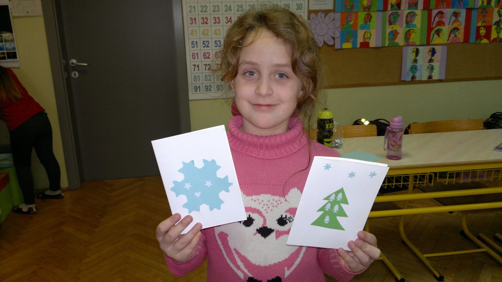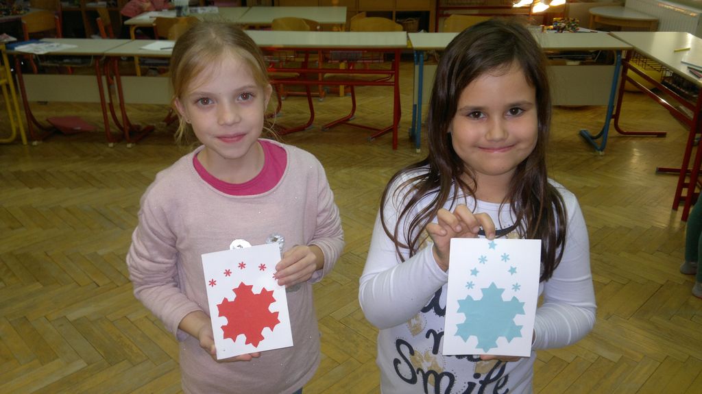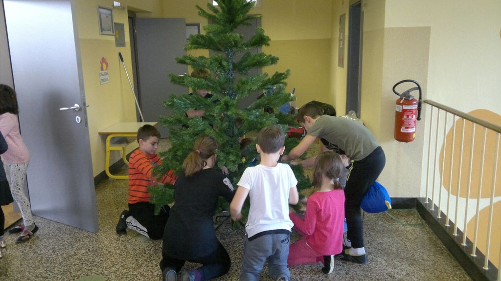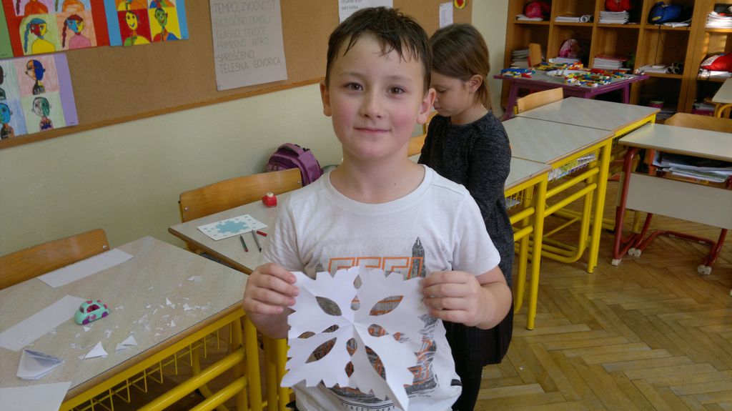 Veseli december se je kot vsako leto začel pestro. V tem prazničnem vzdušju smo se vsi navdušili nad izdelovanjem zimske in božične dekoracije. Iz časopisnega papirja smo izrezovali razno velike kroge (žoge), ki smo jih pobarvali z modro in belo tempero. Pritrdili smo jih na okna. Tudi naša okna na hodnikih smo okrasili. Iz belega papirja smo izrezovali snežinke in jih pritrdili na njih. Ker se je bližal Božič, smo na hodniku pred razredi postavili in okrasili smrečico. Sredi decembra smo izdelali še voščilnice in vanje zapisali majhna voščila našim družinam. Sejali smo božično žito in barvali božične pobarvanke. Prav tako smo si izdelali snežaka vrtljivka. Na koncu smo si izdelali staro igračo. Vrezali smo meter volne in naredili zanko. Naučili smo se prepletanja vrvice in kako se preda sošolcu. V tem mesecu smo nekaj časa posvetili prometnim znakom. Naučili smo se, kako jih ločiti po obliki in barvi. Nekaj znakov smo si izdelali in v razredu sestavili cestišče. Ob hoji med mizami, so učenci morali upoštevati prometne znake in semafor. Vsi smo se veliko naučili in nasmejali. Ker je bilo decembra tako toplo, smo veliko časa preživeli tudi zunaj. Šli smo se razne igre in se zabavali.