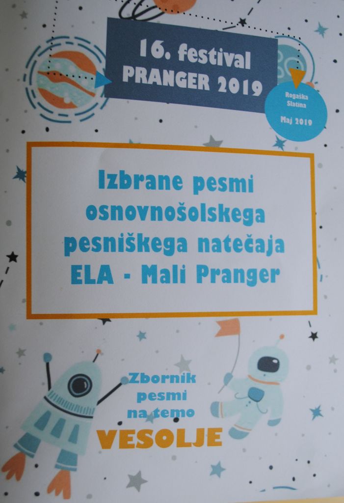 V Rogaški Slatini je bila v soboto, 25. 5. 2019, slavnostna podelitev priznanj izbranim pesmim osnovnošolskega natečaja Ela- Mali Pranger.