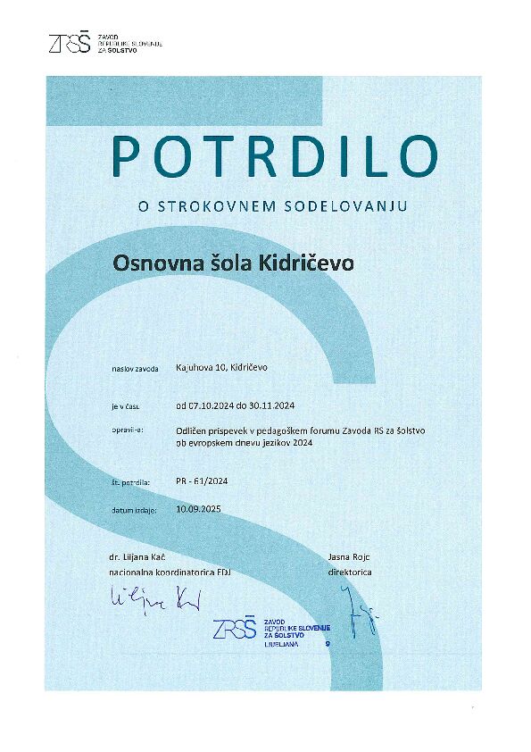 Priznanje za leto 2024 je prejela tudi Osnovna šola Kidričevo s prispevkom Raziskujemo evropske jezike: z besedami želimo mir Evropi.
