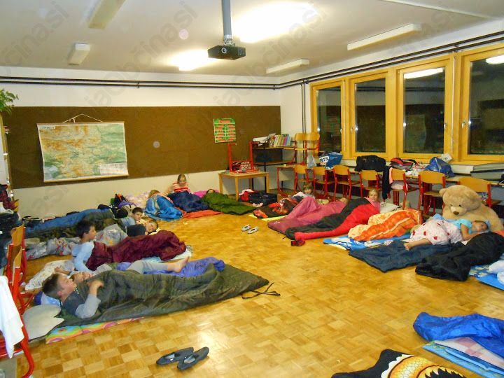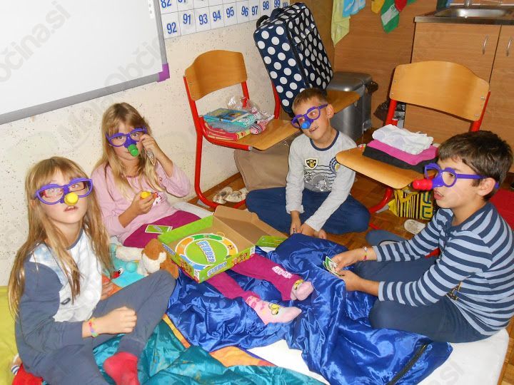 Bil je četrtek, 2. 10. 2014, ko smo vsi prišli v šolo s prtljago. Že smo se veselili spanja in dogodivščin, ki jih bomo doživeli ta dan. Seveda pa nas je čakalo še sedem učnih ur, za katere smo vsi hoteli, da hitro minejo. In tako je tudi bilo. Hitro je prišlo na vrsto kosilo. Po njem smo se igrali razne družabne igre, ki so se hitro končale, in šli ven iskat izgubljeno pravljico. Ko smo našli vse koščke, smo ugotovili, da je naslov pravljice Harry Potter: Kamen modrosti, ki smo jo nato tudi prebrali. Pekli smo si kostanje in klobasice. Okrog 19. ure smo odšli v razrede in si uredili ležišča ter odšli na večerjo. Jedli smo kuhan krompirček z našega vrta. Sledilo je odprtje knjižnice, na katerem je Sanja Kranjc, učenka petega razreda, prebrala dve pesmi Otona Župančiča. Odšli smo vsak v svoj razred, takrat pa nam je ga. Zlatka Podvornik prebrala pravljico Železni prstan. Kasneje smo odprli sladkarije in si ogledali film Ledeno kraljestvo. Spat smo odšli okrog pol desetih. Naslednji dan pa smo se igrali Talente. Preostanek dneva je potekal običajno.