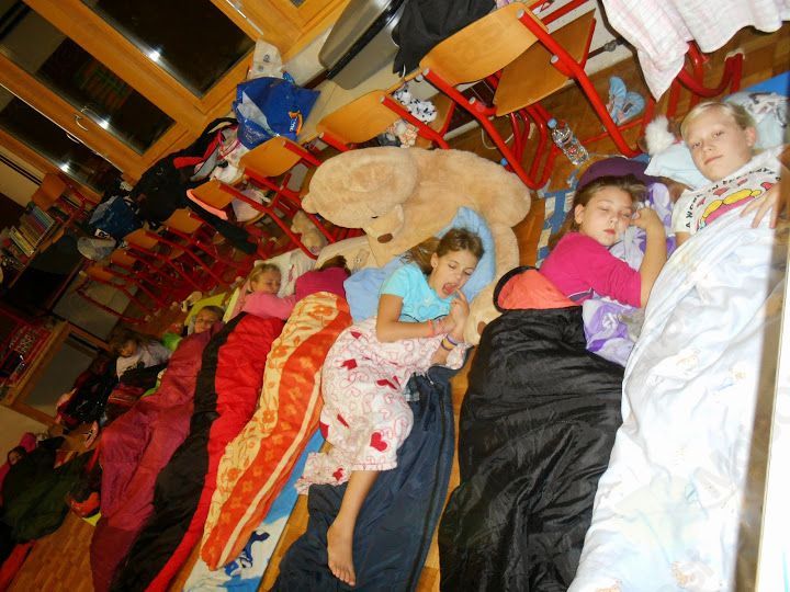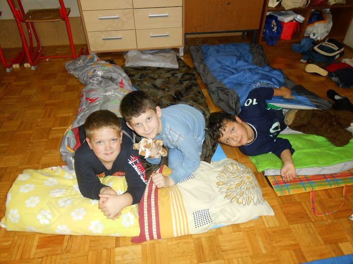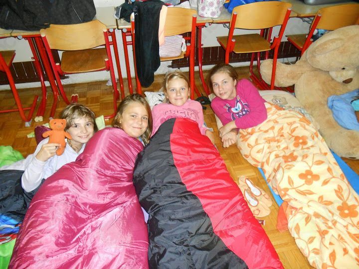 Zjutraj sem se zbudila. Bil je četrtek, dan, ko smo prespali v šoli. Tja sem odšla z vso prtljago, ki smo jo potrebovali. Ko sem prišla v šolo, smo imeli pouk kot vsak dan. Nato se je pouk končal in vsi smo se zbrali pred šolo. Igrali smo se različne igre, kot so iskanje pisem, igre po želji, in si pekli klobase ter kostanje. Ko smo našli vsa pisma, smo sestavili naslov in zgodbo. Naslov je bil Kamen modrosti. Nato smo se še igrali, jedli kostanje in klobasice. Ta čas zunaj je hitro minil in ob 19. uri smo odšli nazaj v šolo. Takrat smo si pripravili vse za spanje in se preoblekli v pižame. Ko smo to vse storili, smo šli v pižamah na večerjo. Ko smo se najedli, smo se še malo igrali in nato nam je ga. Zlatka Podvornik prebrala pravljico Železni prstan. Kasneje smo se še malo igrali in nekje čez eno uro odšli gledat film Ledeno kraljestvo. Bil nam je zelo všeč. Sredi filma smo si podajali različne sladkarije in jih jedli. Imeli smo tudi odprtje knjižnice. Ko smo prerezali trak, smo si lahko ogledali knjižnico in dobili bonbone. Nato smo se pripravljali na spanje. Odšli smo spat, vendar nekateri niso mogli zaspati, ker so se smejali in čudno obnašali. Čez nekaj časa smo le zaspali. Noč smo preživeli zelo lepo, a so tla bila malo trda. Naslednji dan je bil petek. Zjutraj smo se vsi zbudili in zabavali. Nato smo odšli na malico. Po malici smo imeli »Pokaži svoj talent«. Ko smo to vse končali, se nam je pouk normalno nadaljeval. Ta pouk se nam je dolgo vlekel in mislili smo, da se ne bo nikoli končal. A nato se je le končal in smo odšli na kosilo. Po njem smo šli v popoldansko varstvo in uživali, dokler se nismo odpravili domov.