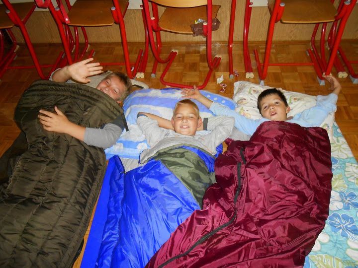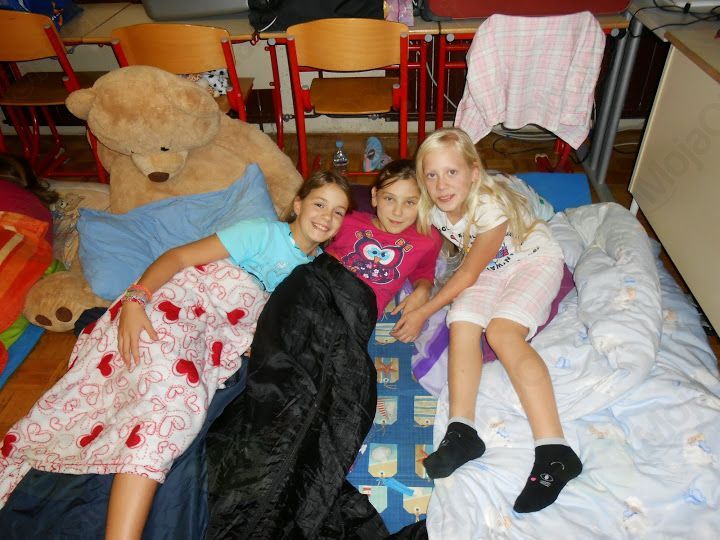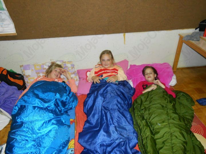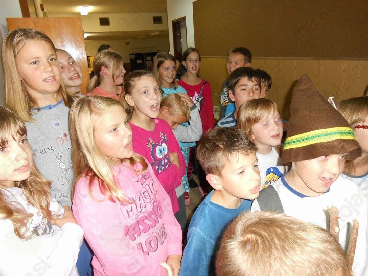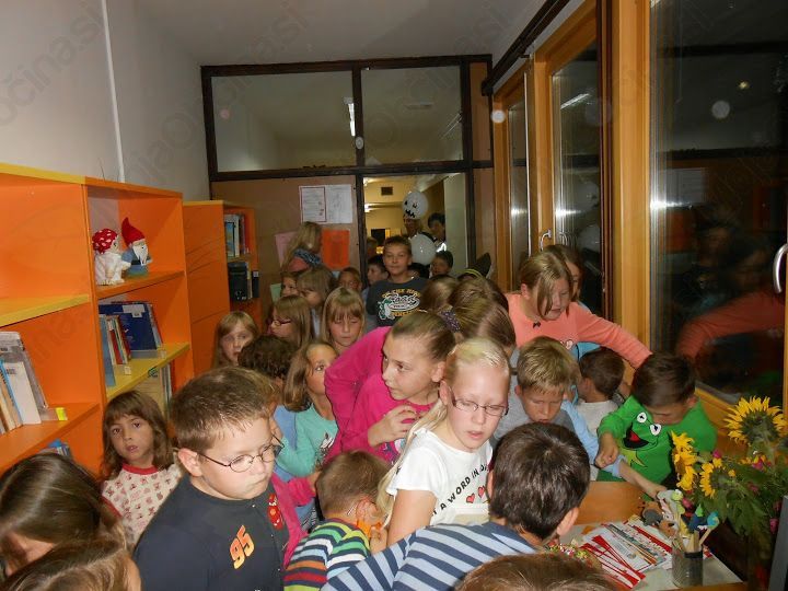 Bil je 2. 10. 2014, ko smo prišli v šolo z vso prtljago. V šoli smo imeli pouk po urniku. Ko je bila ura tri, smo se igrali različne igre. V razred je prišla naša učiteljica in rekla, da naj se obujemo in gremo pred šolo. Nato so nam učiteljice razložile, da moramo poiskati 12 delčkov pisma. Ko smo jih našli, smo prebrali, kaj je pisalo. Ker smo razbrali besedno zvezo »pralni stroj«, smo šli pogledat vanj. Tam smo našli skrinjo, v kateri so bile čokolade. Vsak si je vzel eno. Ob 17. uri smo si pekli klobase in kostanje. Ob 19. uri smo se odpravili noter in se preoblekli v pižame. Šli smo jest krompir, bil je zelo dober. Ko smo se najedli, smo imeli odprtje knjižnice. Moja sošolka Sanja je prebrala pesmici. Ko se je vse končalo, je k nam prišla ga. Zlatka Podvornik in nam prebrala pravljico Železni prstan. Bilo je zanimivo. Ko se je pravljica končala, smo si ogledali še film Ledeno kraljestvo. Bil je zelo lep. Film se je končal in mi smo šli spat. V petek smo se zbudili in se igrali Slovenija ima talent. Nato smo imeli spet pouk. Tako se je iztekel dan.