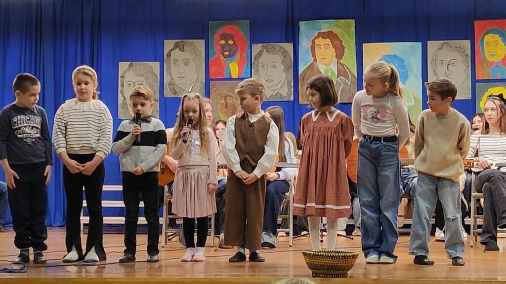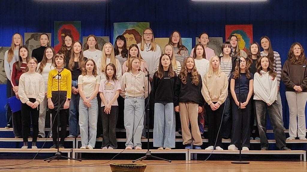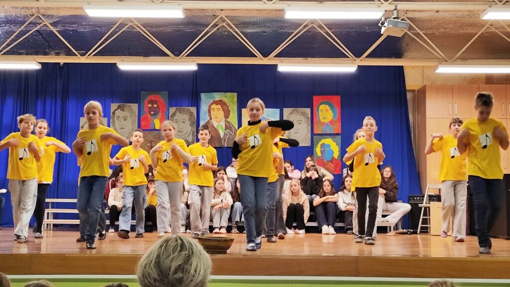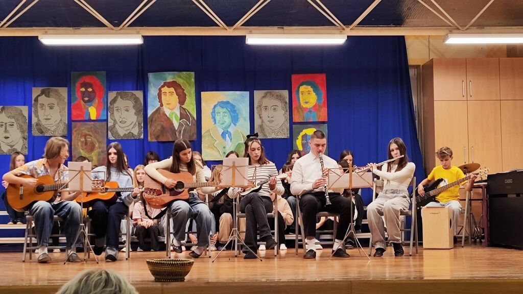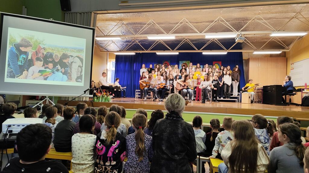 Zaključek proslave je bil prežet s pesmijo in z likovno umetnostjo. Ob glasbeni spremljavi je bila predstavljena tudi projekcija likovnih del učencev, ki je pokazala raznolikost ustvarjalnosti in potrdila, da kultura živi tudi v barvah, oblikah in domišljiji.