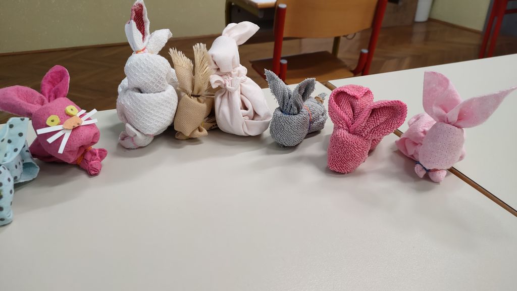 Pri pouku slovenščine smo pri poglavju Opis postopka najprej preučili celoten potek izdelave velikonočnega zajčka iz barvne vilede krpe in navadnih gumic.
