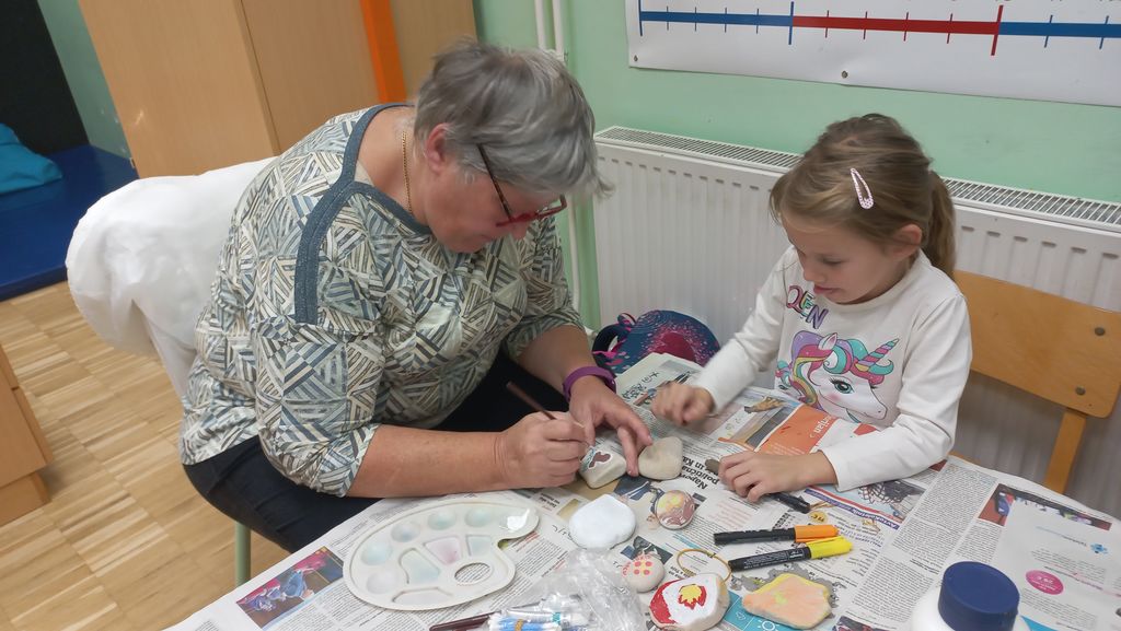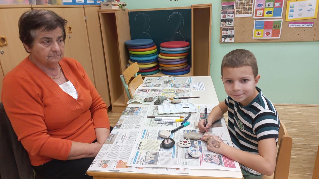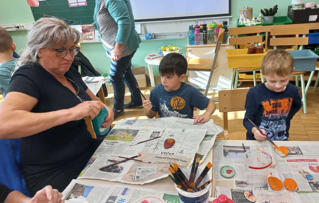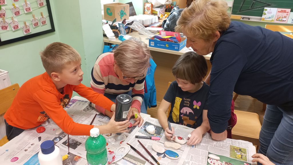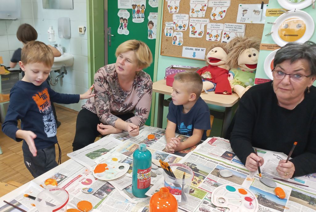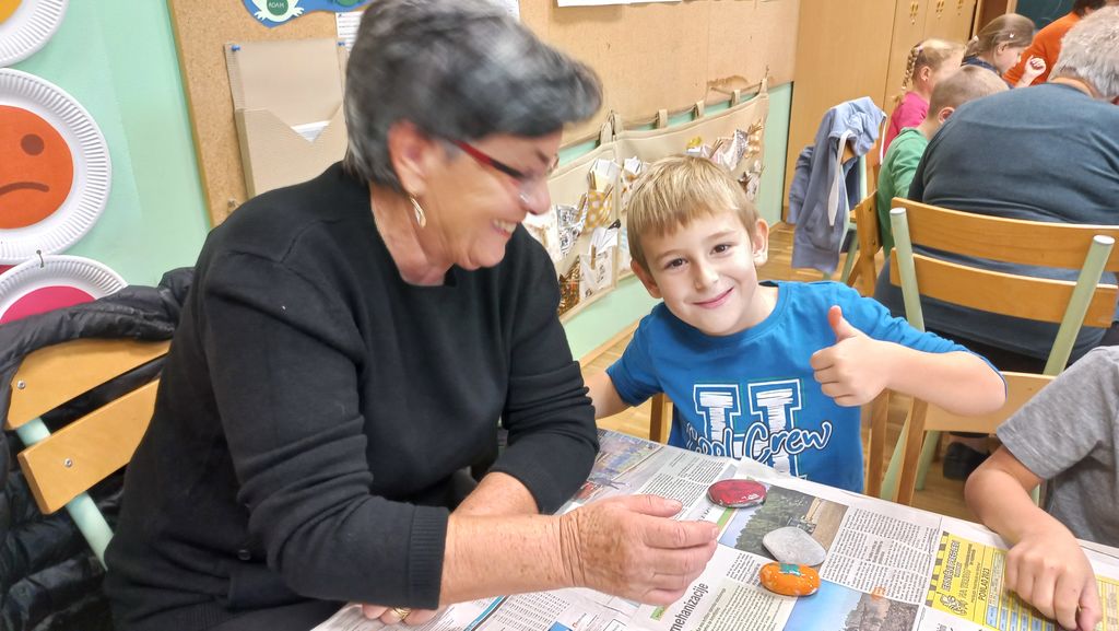 Zato smo v četrtek, 9. 11. 2023, v našo učilnico povabili babice. Z veseljem so se nam pridružile pri poslikavi kamenčkov prijaznosti. V odličnem tandemu s svojimi vnuki in vnukinjami smo ustvarili krasne kamenčke prijaznosti. V ponedeljek, 13. 11. 2023, smo kamenčke nastavili v šoli delavcem šole in našim velikim prijateljem (tutorjem) iz devetega razreda. Presenečenje je uspelo. Na obrazih so se narisali nasmehi. Nekaj kamenčkov pa je pričakalo nove lastnike na naključno izbranih javnih mestih.