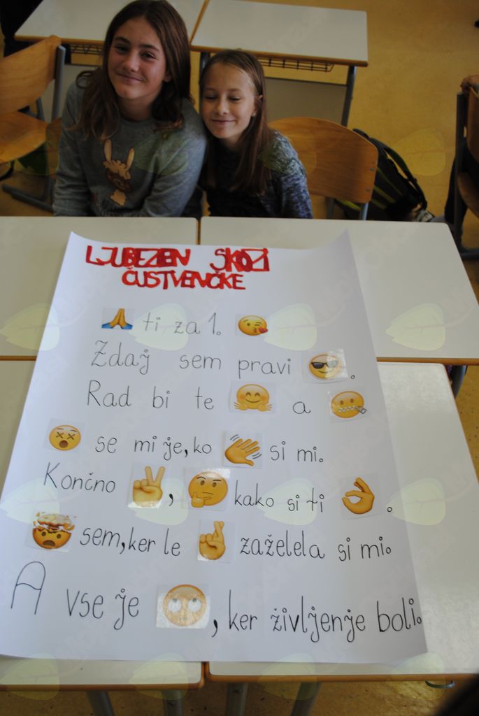 Sodobna pisava je danes sploh za malo starejše zelo nerazumljiva. Prehaja nazaj k znakom in s temi – čustvenčki, lahko povemo zelo veliko, pisati je mogoče tudi tovrstno poezijo, kar so počeli učenci pod vodstvom učiteljice Nastje Bat.