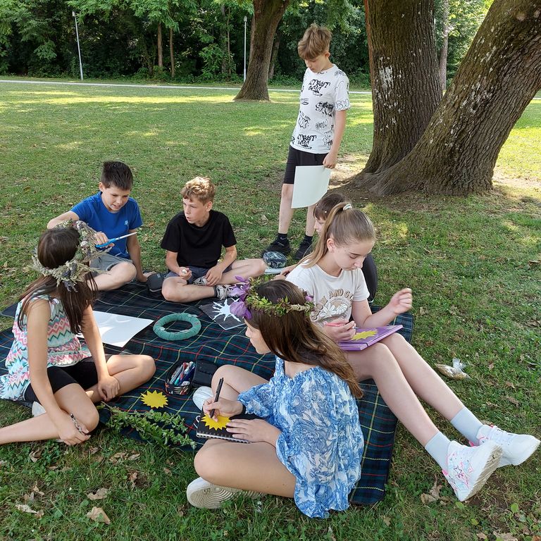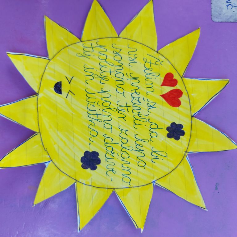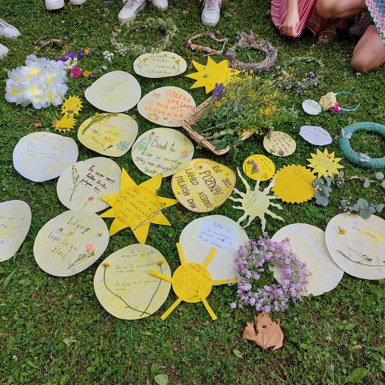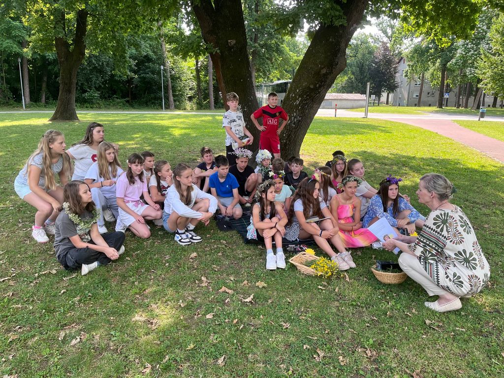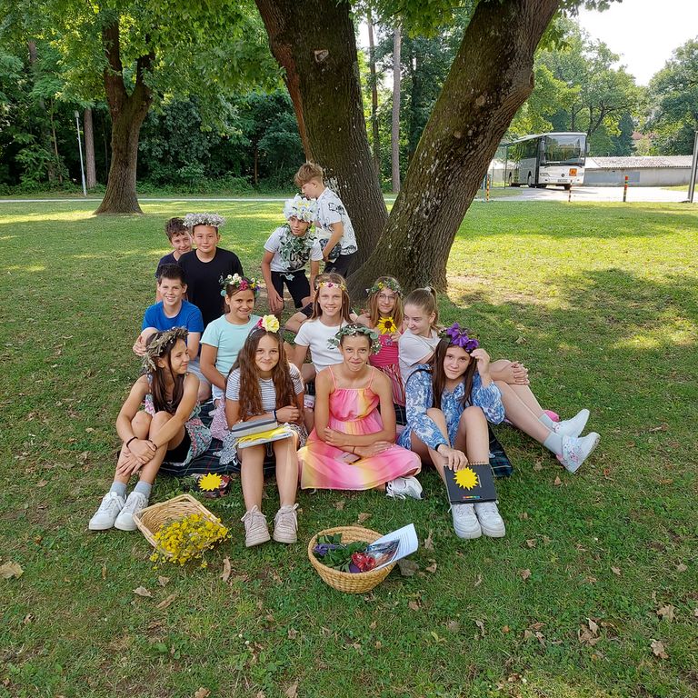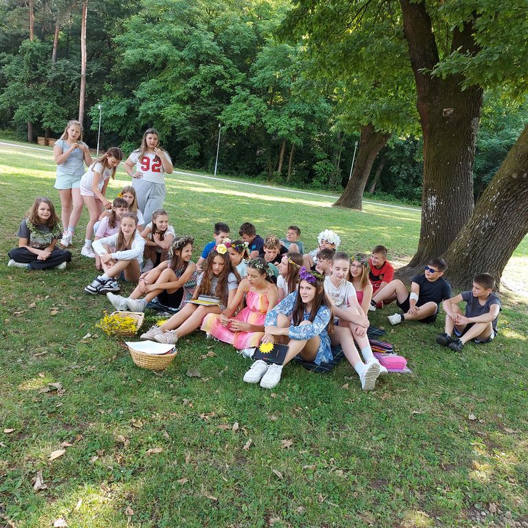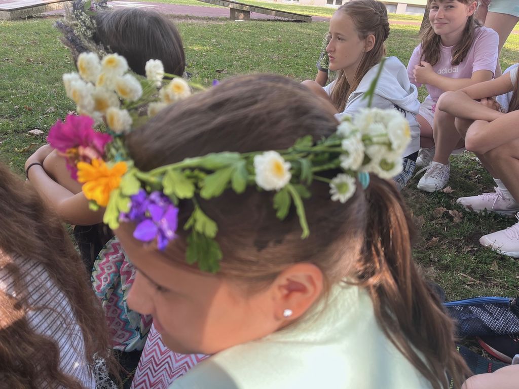 Naši šestošolci so spletli venčke, se lahkotno oblekli, izdelali rumene papirčke v obliki sonc, na katere so napisali in narisali sončne želje. Pod velikim hrastom na šolskem dvorišču so z venčki na glavah peli pesmi o naravi, pisali srčne sončne želje in neskončno uživali.