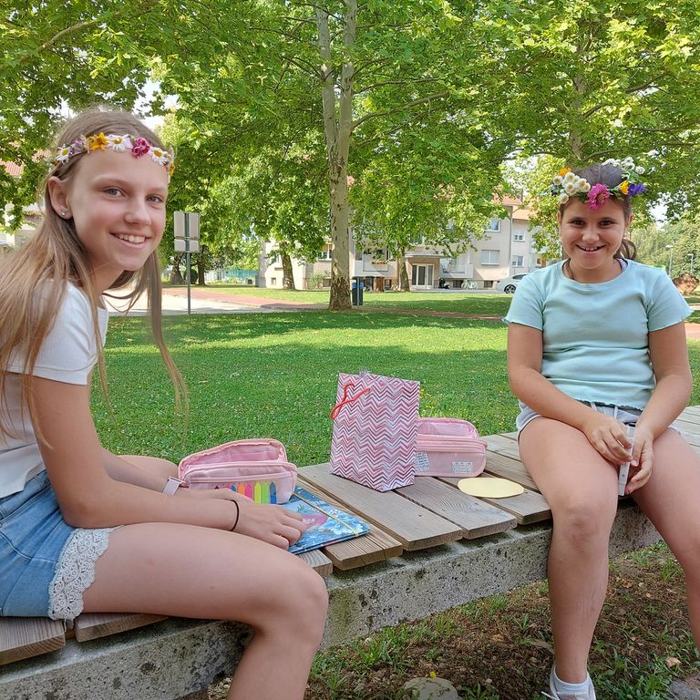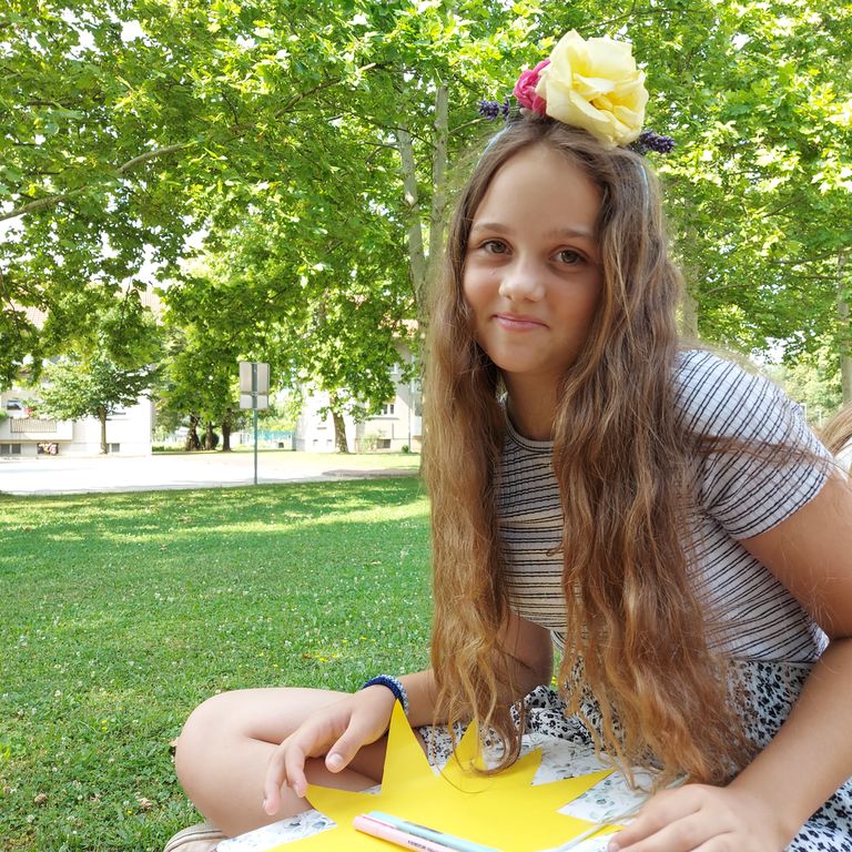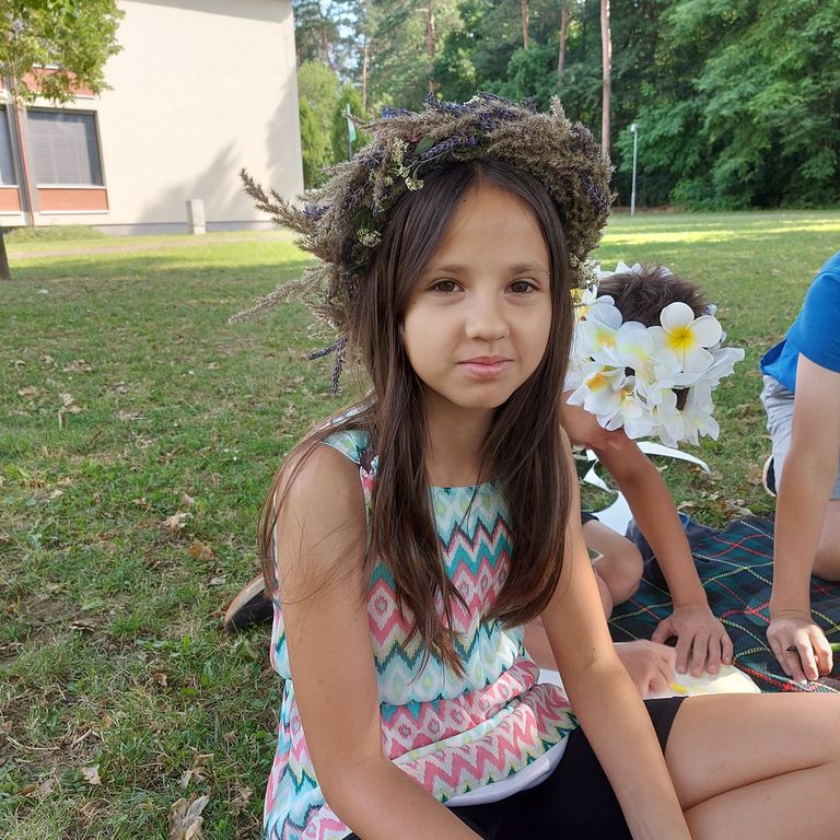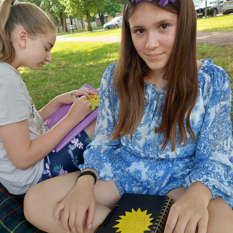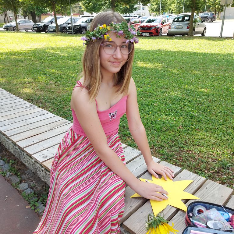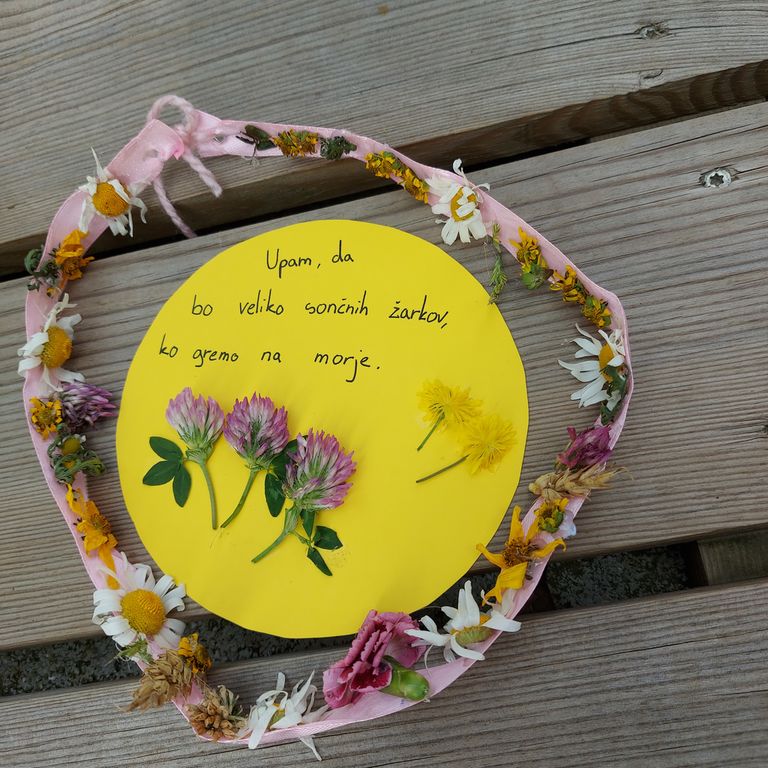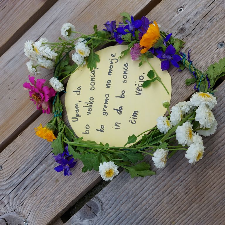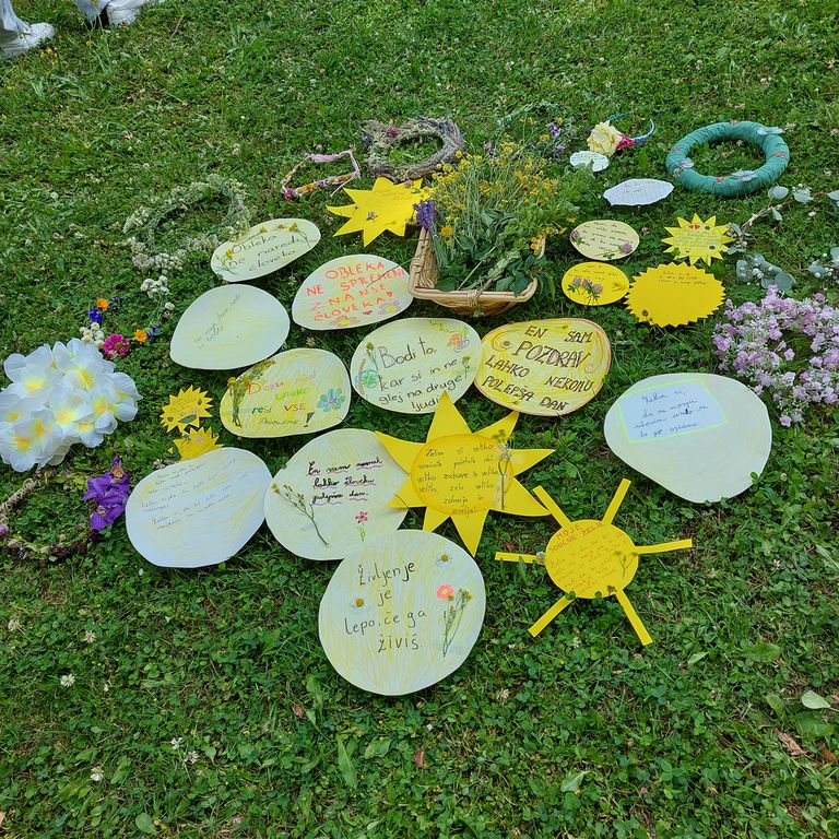 Naši šestošolci so spletli venčke, se lahkotno oblekli, izdelali rumene papirčke v obliki sonc, na katere so napisali in narisali sončne želje. Pod velikim hrastom na šolskem dvorišču so z venčki na glavah peli pesmi o naravi, pisali srčne sončne želje in neskončno uživali.