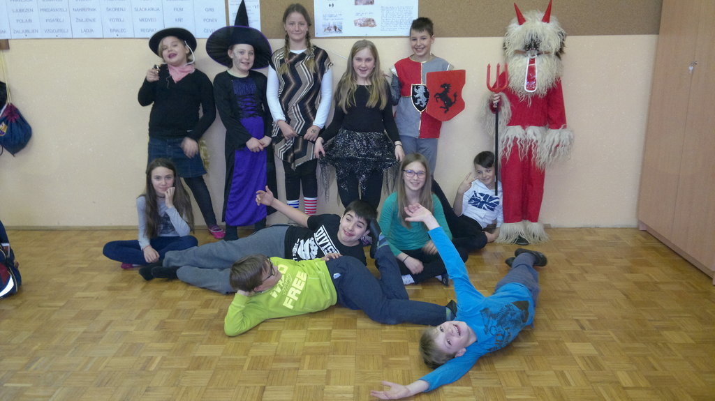 V šolo sem prišel zgodaj zjutraj. Bil sem oblečen v okostnjaka. Dokler nismo odšli v Kidričevo, smo izdelovali maske iz papirja. Ob 9. uri smo imeli malico, jedli smo sirove štručke. Ob 10.30 smo odšli v Kidričevo. Najprej smo imeli kosilo. Po njem smo se zbrali v avli šole. K nam so prišli kurenti. Odšli smo v park. Tam smo se igrali s prijatelji. Zelo smo se zabavali. Ko pa sem prišel domov, sem bil zelo utrujen. Cel popoldan sem ležal in počival.