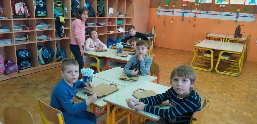 Po malici je prišla gospa Lidija Kores. Pripravili smo si pripomočke za risanje. Najprej nam je povedala, kje bomo risali in dala nam je čopiče in druge pripomočke. Nato smo začeli risati. Pokazala nam je, kaj rišemo in povedala navodila. Skupaj smo se fotografirali. Ko smo končali, smo pomagali pospravit in slike smo obesili v avlo.