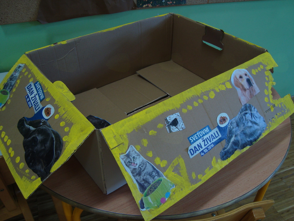 V razredu so učenci izdelali škatle za zbiranje hrane, plakate o živalih, jaz kot razredničarka pa sem napisala poziv k zbiranju hrane in potrebščin za živali. Plakate in pozive smo obesili po celi šoli. Štiričlanska delegacija drugošolcev je poziv k akciji prebrala vsem učencem pri razredni uri ter preko šolskega radia. Objava je bila tudi na šolski spletni strani. Škatle smo vsaki dan praznili in zbirali hrano na določeni lokaciji v šoli. Akcijo smo zaključili tako, da smo v četrtek, 13. 10.2016, pripravili srečanje z gospo Kristino Pšajd. Povabili smo vse učence drugega in tretjega razreda ter predstavnike višjih razredov. Srečanje je potekalo v obliki pogovora. Svoje misli so nizali vsi udeleženci, postavljali vprašanja in pripovedovali o svojih izkušnjah. Gospa Kristina pa nam je podrobno predstavila delovanje društva in težave, s katerimi se srečujejo prostovoljci, ki pomagajo brezdomnim in zavrženim živalim. Seznanila nas je s konkretnimi primeri zavrženih živali in reševalnimi akcijami. Te zgodbe so se nas dotaknile, ob njih smo ostali brez besed. Izročili smo ji hrano in druge stvari, ki jih živali potrebujejo za svoje preživetje. V enem tednu smo učenci, otroci in delavci šole ter vrtca zbrali: