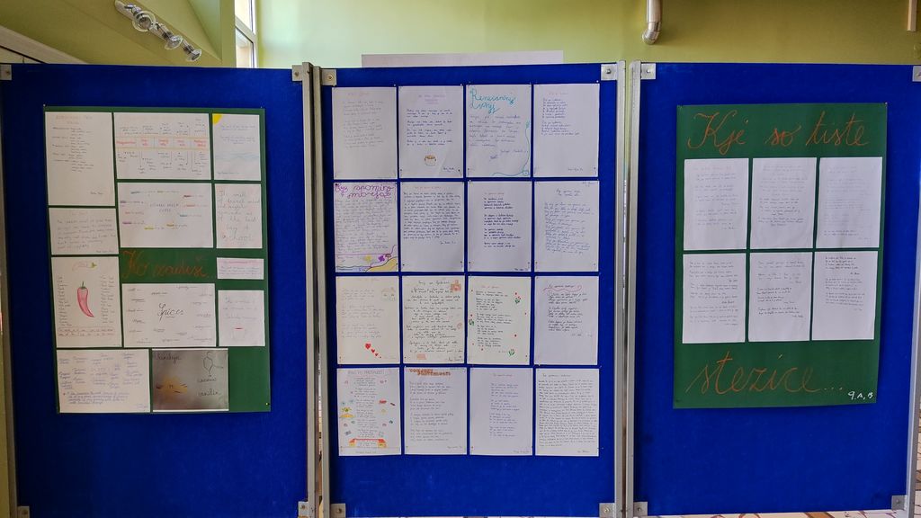 Aleksandra Vidovič, likovna pedagoginja, je izbor izdelkov učencev uredila v čudovito razstavo v šolski avli po smiselnih sklopih: