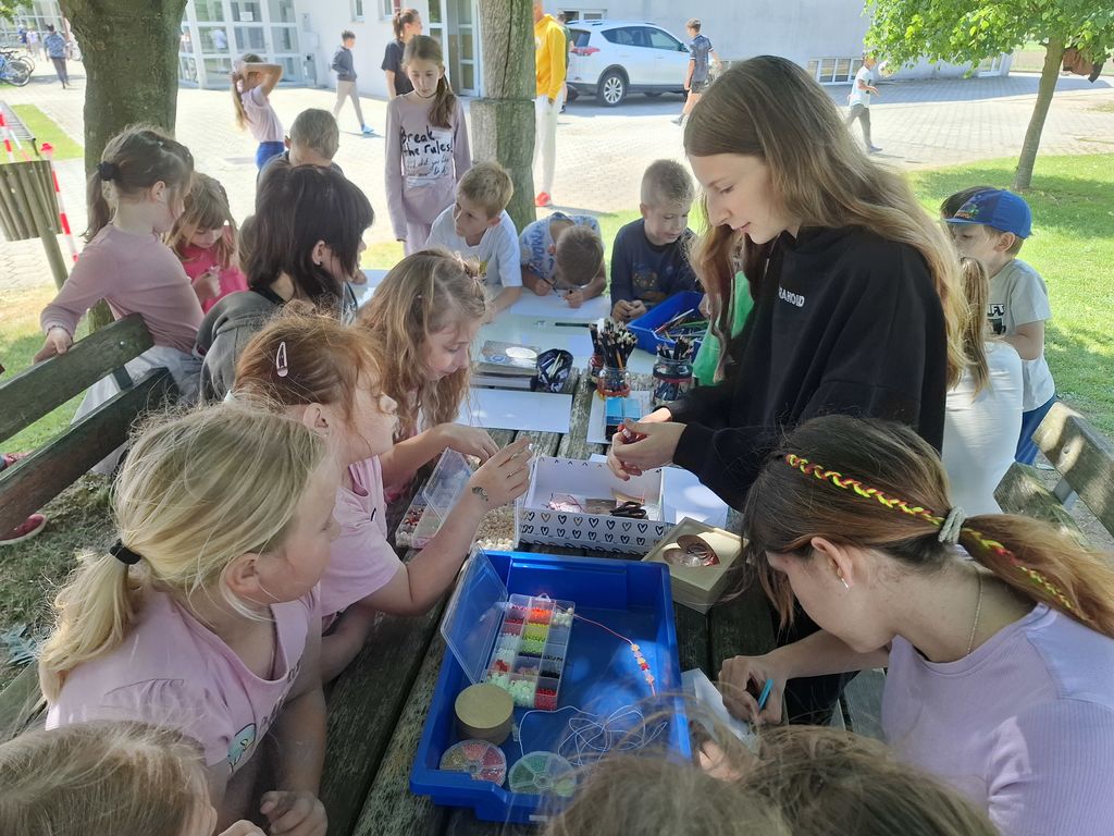 Čakal nas je še zadnji dan Tedna umetnosti na naši šoli. Izvajala se je delavnica gumitvista, folkloristi so nam predstavili novo igro »slepi konj«, s plesnimi ritmi pa sta nam tokrat dan popestrili Alina in Iskra. Saša in Ela sta vodili delavnico poslikave stekla in tekstila, naši kiparski mojstri Matevž, Voranc, Neža, Jan P. (3. a), Lana (3. b), Lucija, Žan in Luka (2. a) so izvedli kiparsko delavnico, za konec pa nas je čakalo še glasbeno presenečenje, saj sta nam na harmoniko zaigrala Filip iz 2. razreda in Vito iz 4. razreda.