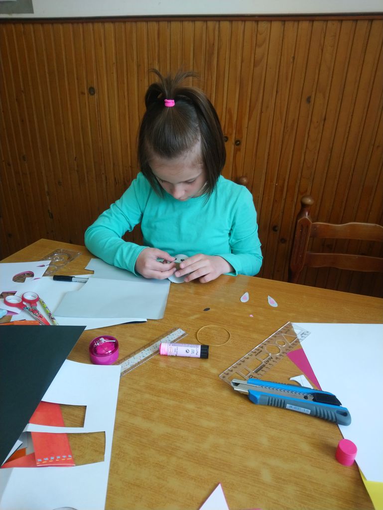 Z učiteljico smo se dogovorili, da bomo izdelali velikonočni izdelek. Izdelke so starši fotografirali in jih poslali učiteljici. Pri izdelovanju sem uporabila material, ki smo ga imeli doma (karton, vroče lepilo, papir, tempera barve, les, plastična jajca). Izdelala sem kartonasto košarico za pirhe, posodico za čokoladna jajčka iz vročega lepila ter zunanjo velikonočno dekoracijo. Pri izdelovanju sem zelo uživala, saj je likovna umetnost moj najljubši predmet.