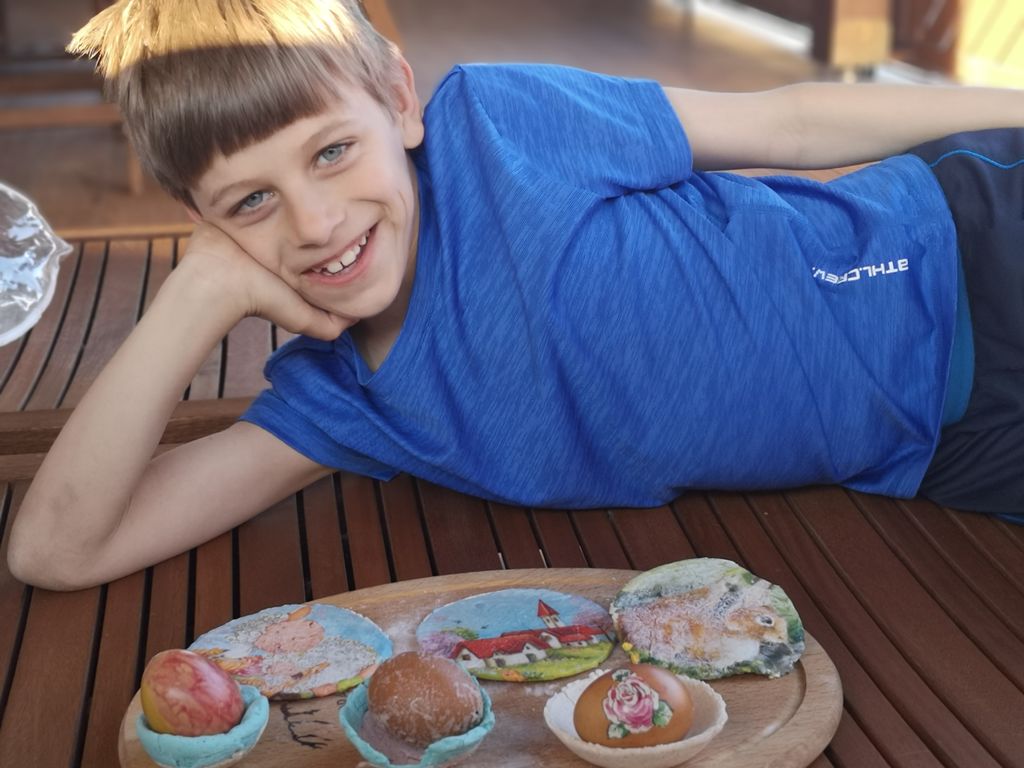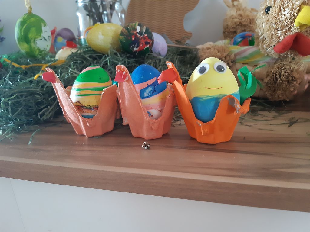 Danes smo imeli tehniški dan na daljavo. Izdelovali smo velikonočne izdelke. S pomočjo mamice sem iz škatle za jajca izrezal posodice, potem sem jih s pobarval s temperami in zalepil kljun ter rep. Ko se je vse posušilo, sem dal v posodice pobarvana jajčka in naredil dekoracijo. Najbolj mi je bilo všeč, ko sem postavljal dekoracijo.