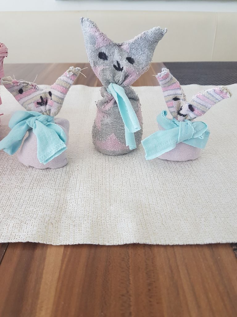 Z učiteljico smo se dogovorili, da bomo naredili velikonočni izdelek. Jaz sem naredila zajčka iz nogavic. Pri izdelovanju mi je malo pomagala mami. Poiskala sem stare nogavičke in jih napolnila z rižem. Zajčkom sem okoli vratu zavezala mašno iz stare majčke. Na koncu sem zgornji del malo odrezala in zašila vsakega posebej, da sem dobila ušesa. Obraz sem narisala s flomastrom. Vesela sem, da mi je zajček uspel. Po delu sem spila zaslužen jagodni sok.
