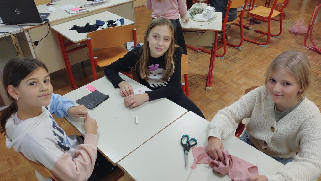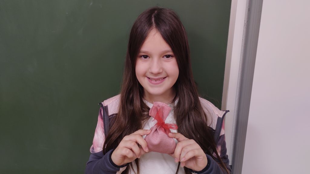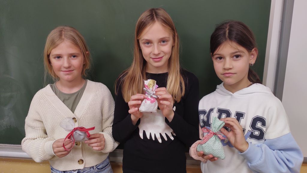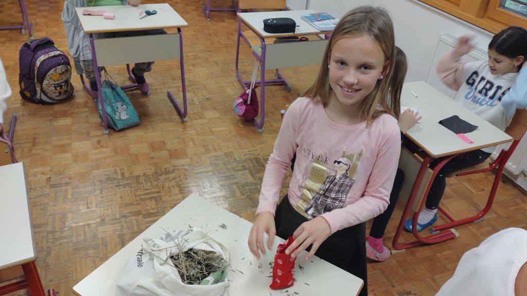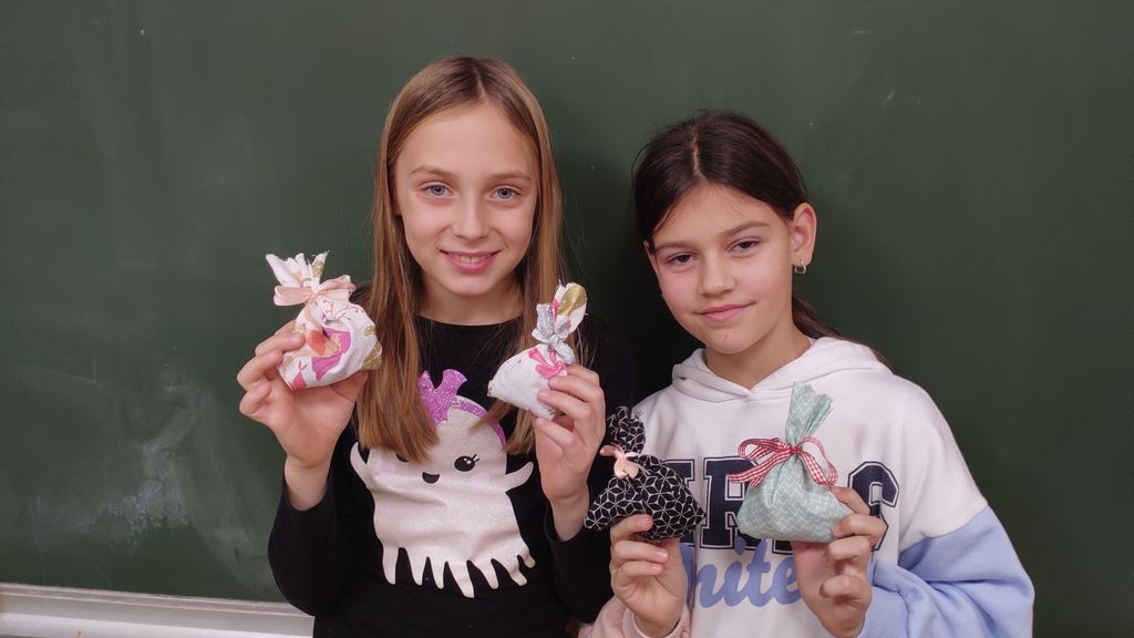 November smo namenili izdelavi izdelkov za šolski bazar. Letos smo se lotili šivanja dišečih vrečk. Najprej smo si pripravili vsak svoj kos blaga, nit in šivanko. Blago smo razrezali na primerno dolžino, napeljali nit in sešili vrečke. Pokazati smo morali kar nekaj spretnosti. Vrečke smo napolnili s posušeno sivko ali rožmarinom. Za konec smo jim dodali še pentlje. Razred je cel november lepo dišal. Prav tako smo risali z barvnimi tuši in tako spoznali novo likovno tehniko.