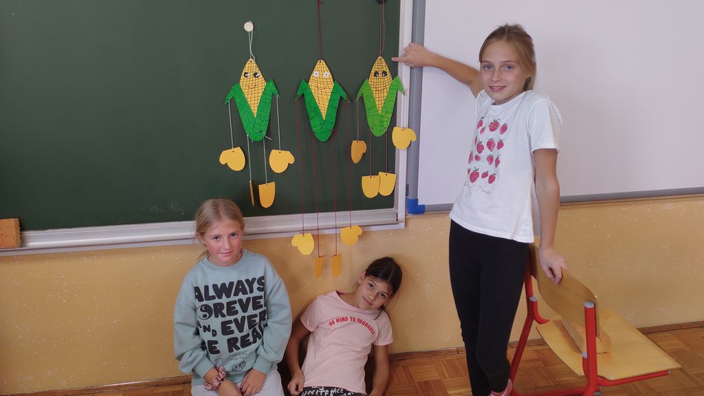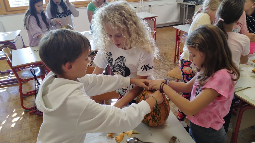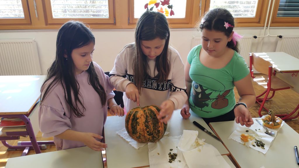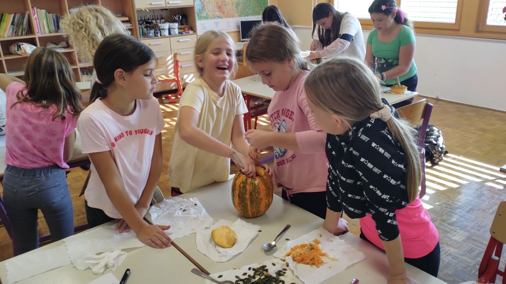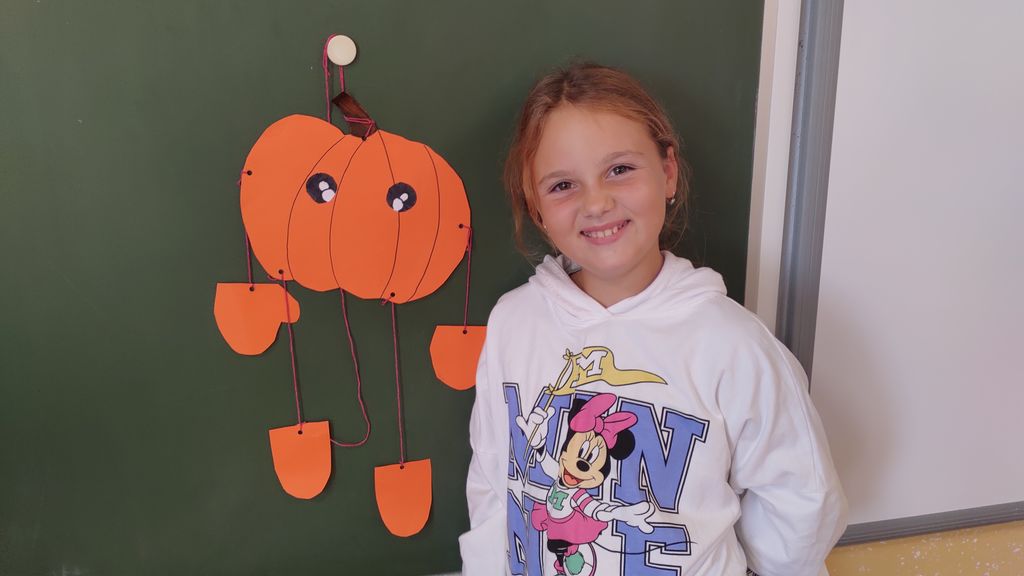 V oktobru smo se pri ustvarjalnicah posvetili jesenski tematiki. Najprej smo si izdelali lutko – jesenski pridelek. Izbirali smo lahko med koruzo, bučo, korenjem in krompirjem. Za izdelavo smo potrebovali šeleshamer in volno. Izdelali smo tudi dekoracijo iz naravnih materialov (palic, storžev in volne). Tako so nastali viseči storži, s katerimi smo okrasili naše domove. Nato smo se lotili okenske dekoracije razredov. Iz rjavega, rumenega, oranžnega in rdečega šeleshamra smo izrezali različno listje, ki smo ga v obliki drevesa pritrdili na okna. Proti koncu meseca, ko se je bližala noč čarovnic, smo bili najbolj navdušeni nad pravo poljsko bučo, saj smo neznansko uživali, ko smo jo spremenili v lanterno. Bučo smo sami izrezali in otrebili. Pri vseh opravilih smo se zelo zabavali.