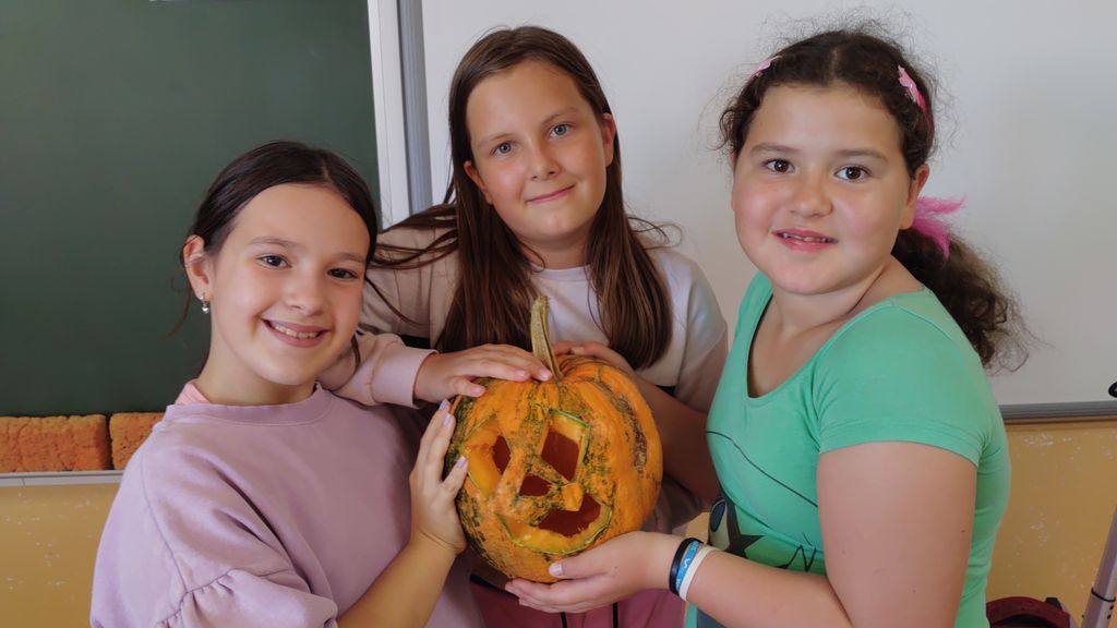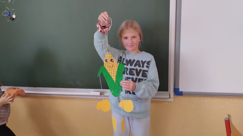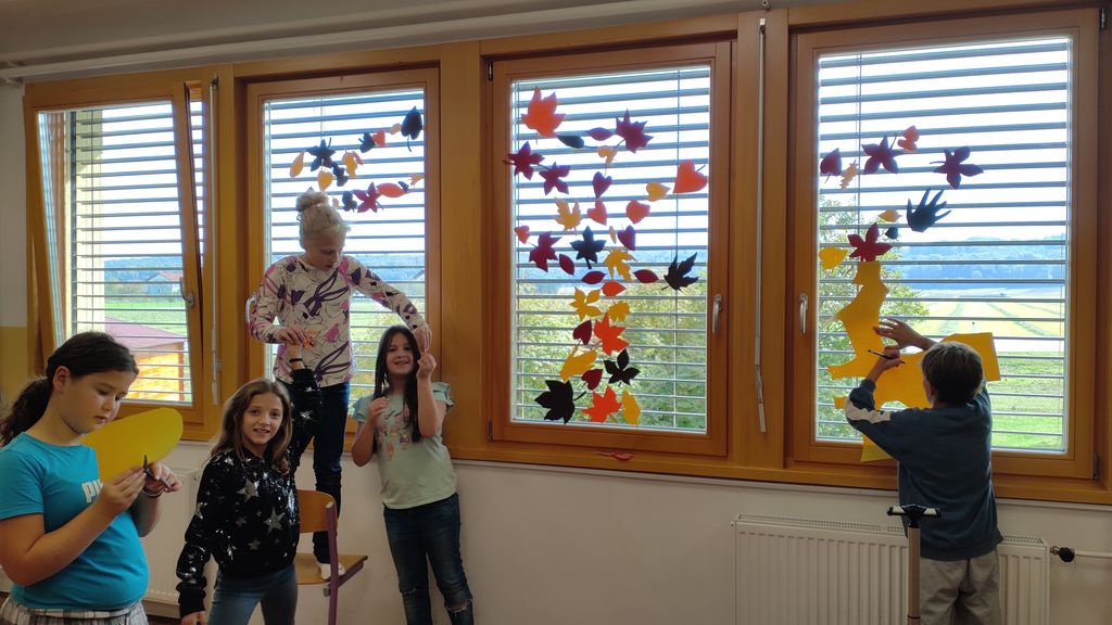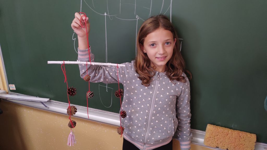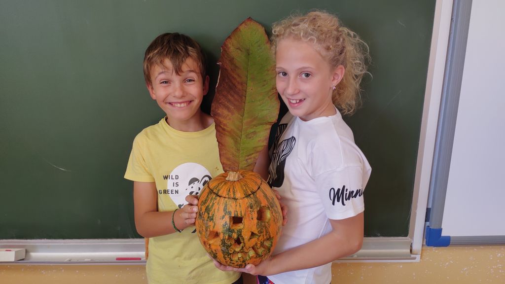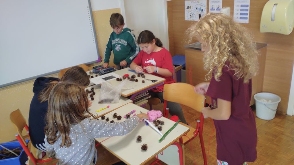 V oktobru smo se pri ustvarjalnicah posvetili jesenski tematiki. Najprej smo si izdelali lutko – jesenski pridelek. Izbirali smo lahko med koruzo, bučo, korenjem in krompirjem. Za izdelavo smo potrebovali šeleshamer in volno. Izdelali smo tudi dekoracijo iz naravnih materialov (palic, storžev in volne). Tako so nastali viseči storži, s katerimi smo okrasili naše domove. Nato smo se lotili okenske dekoracije razredov. Iz rjavega, rumenega, oranžnega in rdečega šeleshamra smo izrezali različno listje, ki smo ga v obliki drevesa pritrdili na okna. Proti koncu meseca, ko se je bližala noč čarovnic, smo bili najbolj navdušeni nad pravo poljsko bučo, saj smo neznansko uživali, ko smo jo spremenili v lanterno. Bučo smo sami izrezali in otrebili. Pri vseh opravilih smo se zelo zabavali.