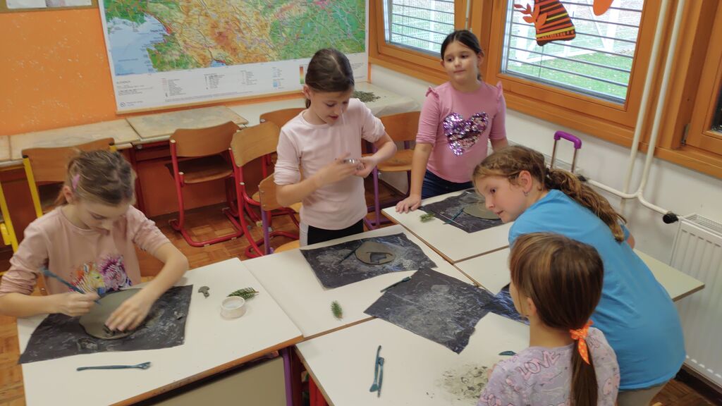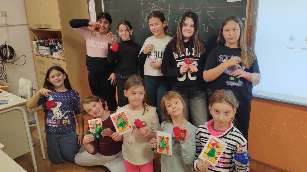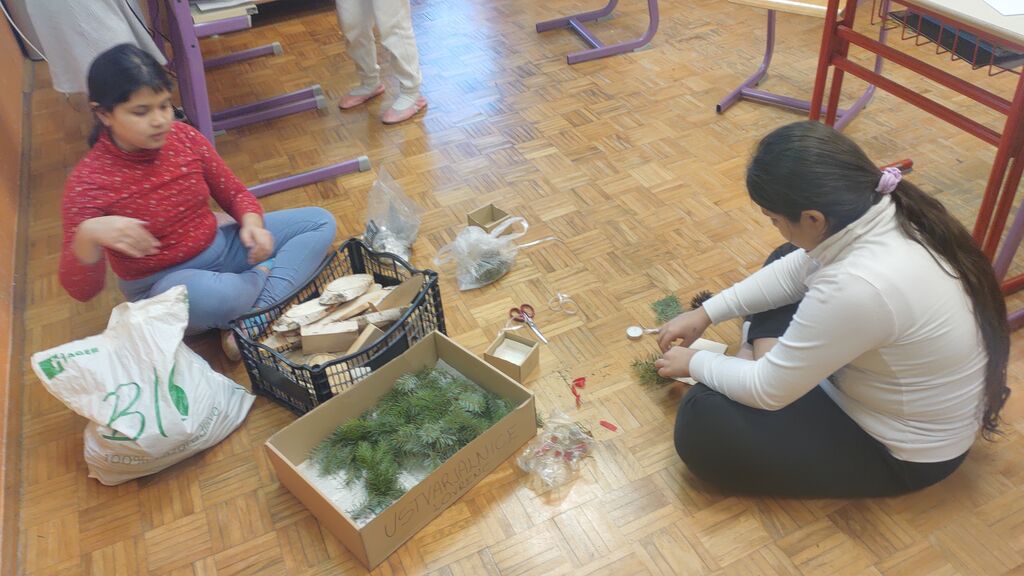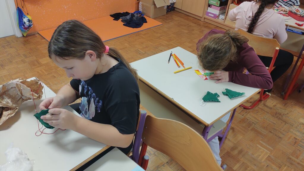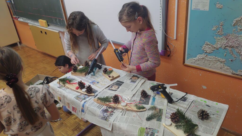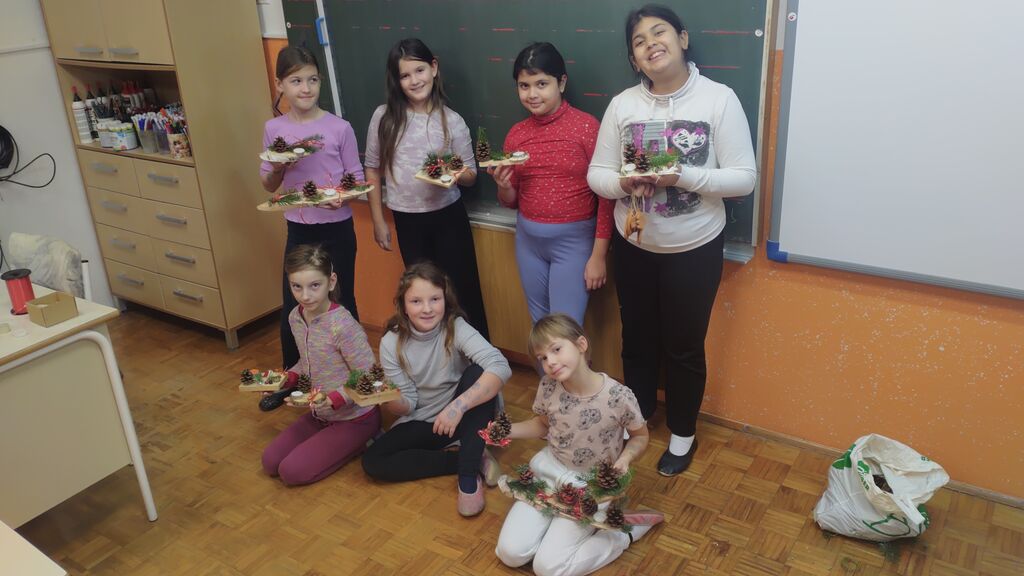 Veseli december se je kot vsako leto začel pestro. V tem prazničnem vzdušju smo se vsi navdušili nad izdelovanjem božične dekoracije. Lotili smo se obeska za smrečico iz filca. Najprej smo izrezali dve obliki srca, nato smo na enega prišili dva gumba, srci smo skupaj zašili z okrasnim šivom in ga napolnili z vato. Kasneje smo se lotili še namizne dekoracije iz naravnih materialov (lesena deščica, mah, vaniljeva palčka, storž, želod), ker pa je bila namenjena božiču, smo dodali še svečko. Tudi voščilnice smo izdelovali iz tršega papirja in na njega lepili zeleno smrečico na ozadju iz toplih barv. Seveda nismo pozabili na okrasitev razreda. Neizmerno smo uživali.