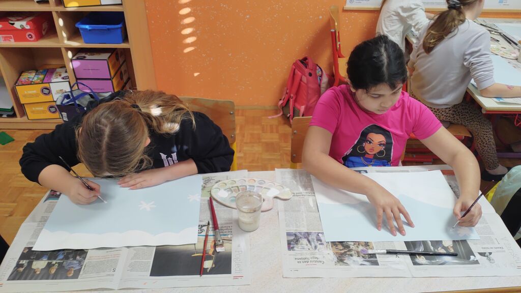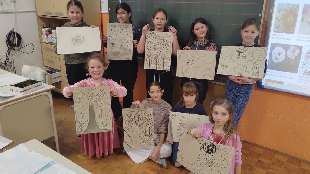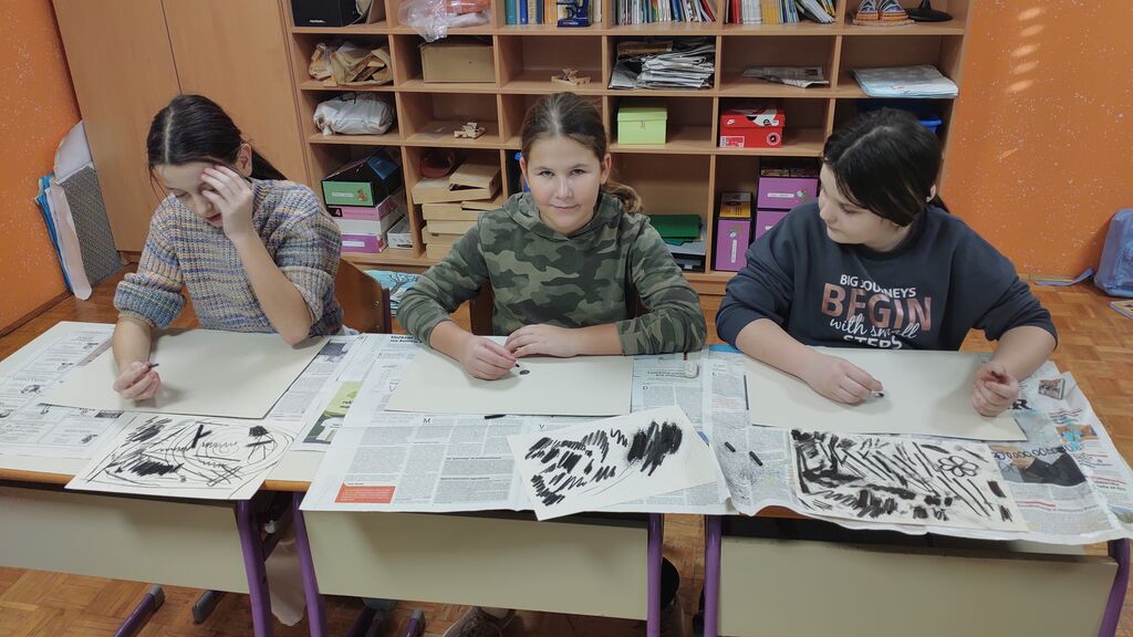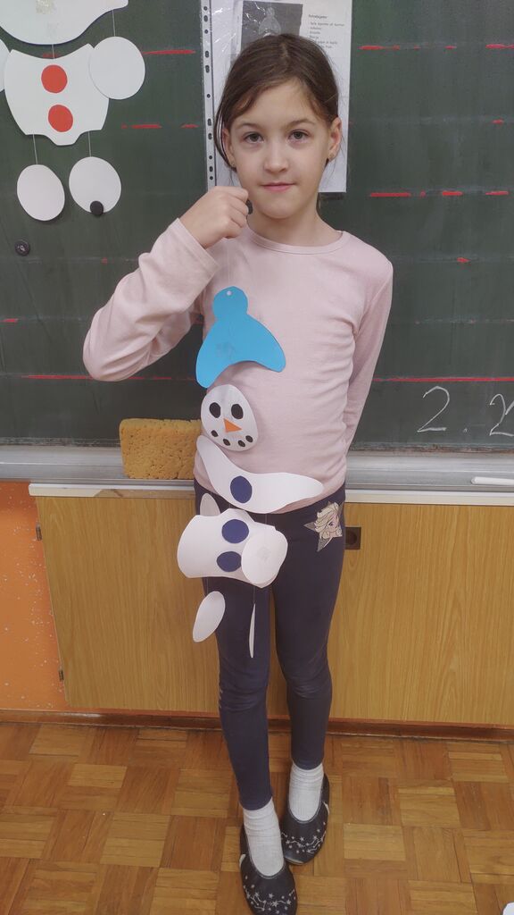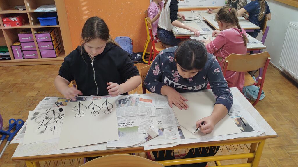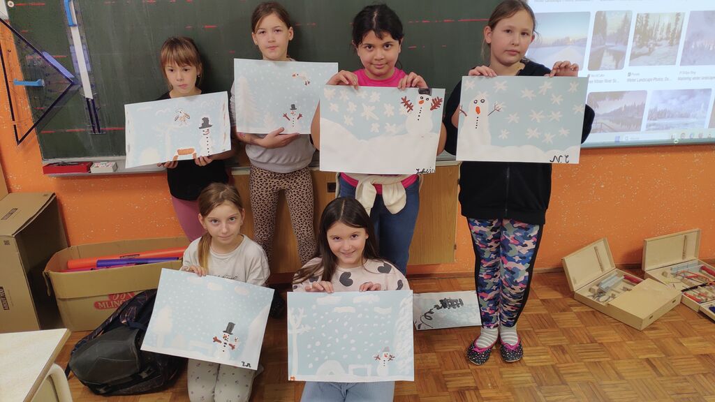 Na začetku novega leta smo slikali zimo na modro podlago. Nato smo risali z ogljem. Izdelali smo si snežaka vrtljivka. Ker pa je v tem času potekal projekt Mesec pisanja z roko, smo se še preizkusili v kaligrafiji. S peresnikom smo pisali različne črke, ki smo jih poljubno okrasili.