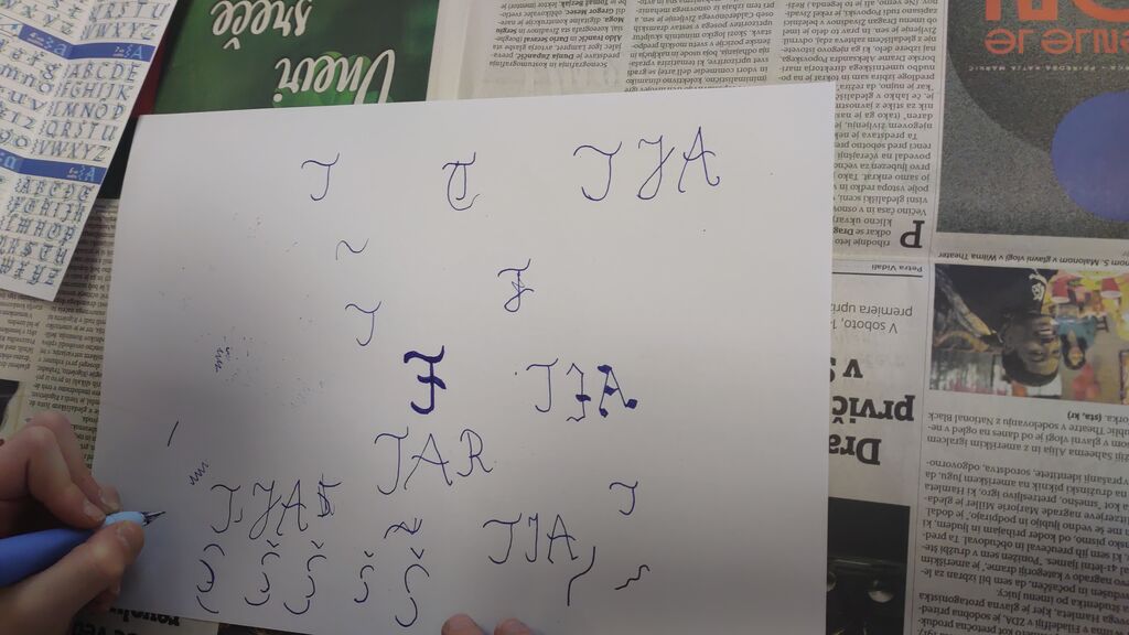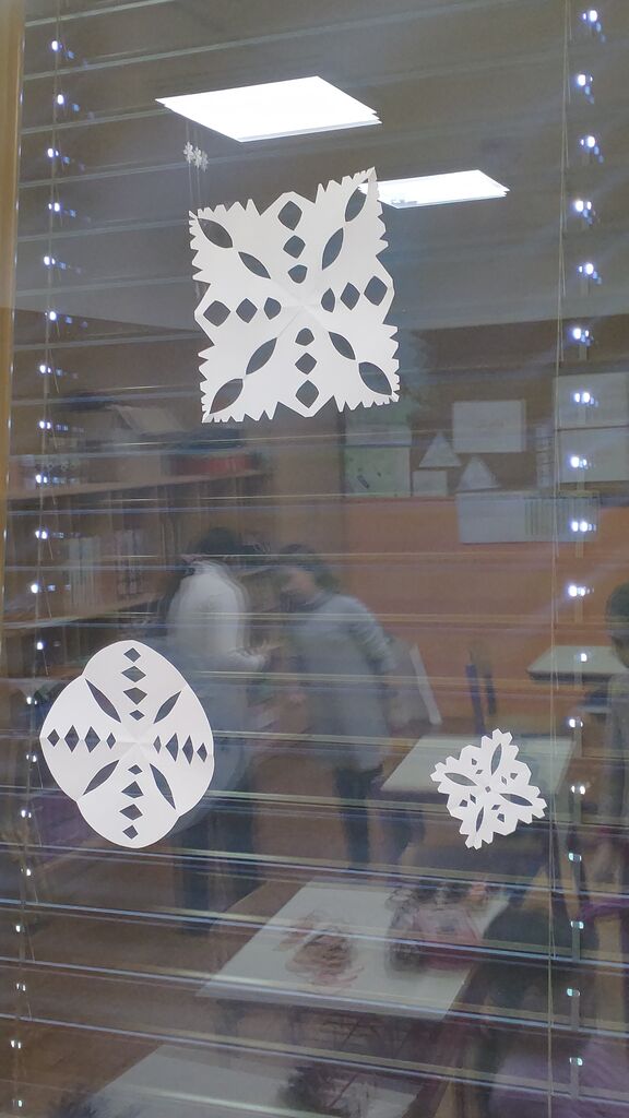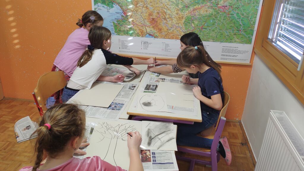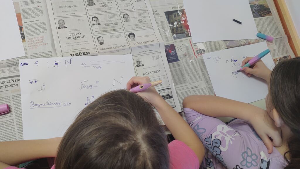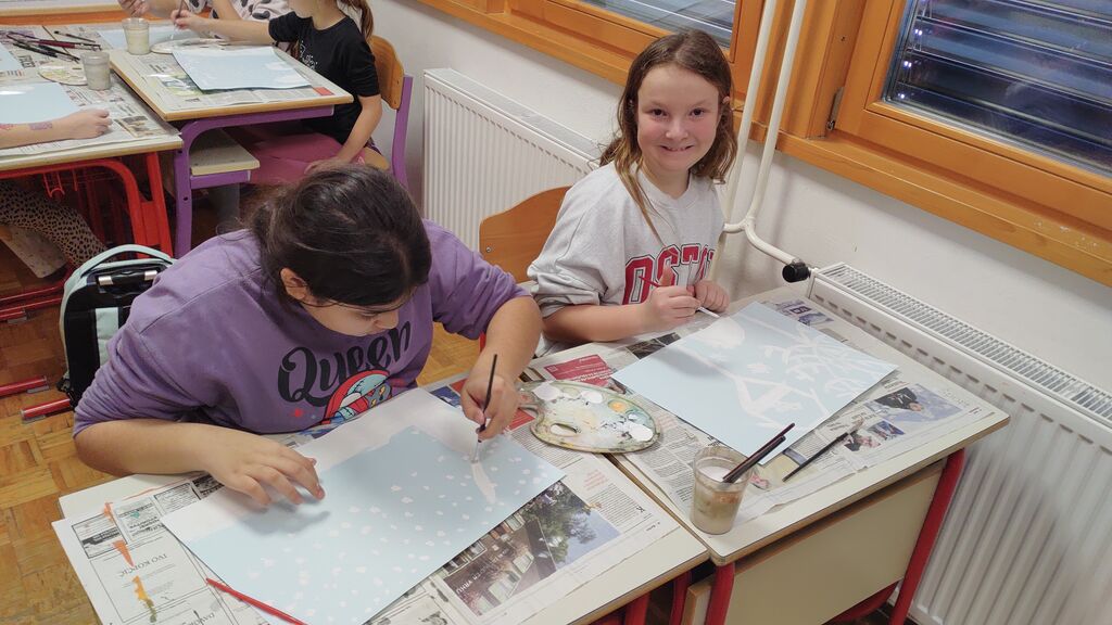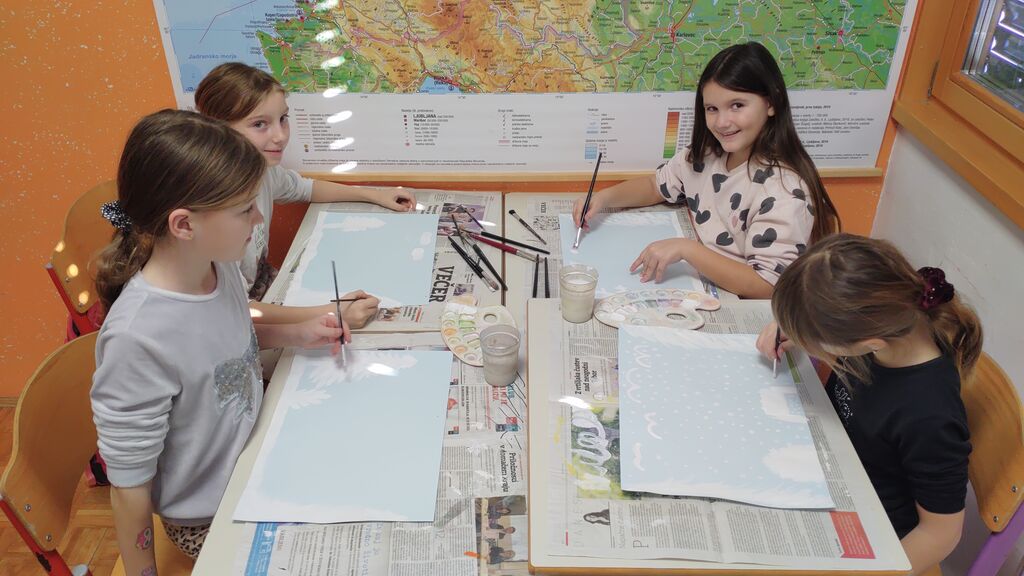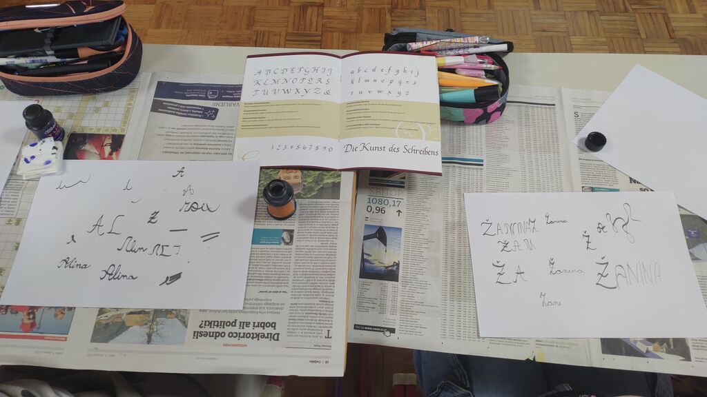 Na začetku novega leta smo slikali zimo na modro podlago. Nato smo risali z ogljem. Izdelali smo si snežaka vrtljivka. Ker pa je v tem času potekal projekt Mesec pisanja z roko, smo se še preizkusili v kaligrafiji. S peresnikom smo pisali različne črke, ki smo jih poljubno okrasili.