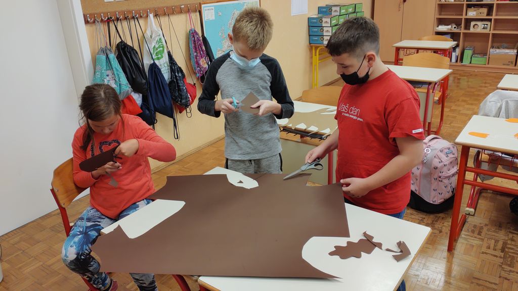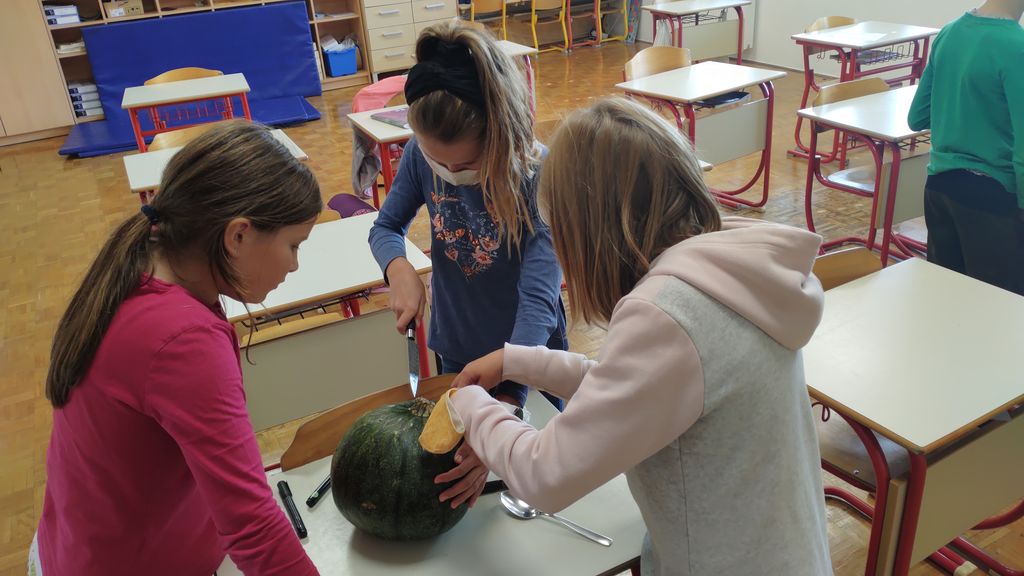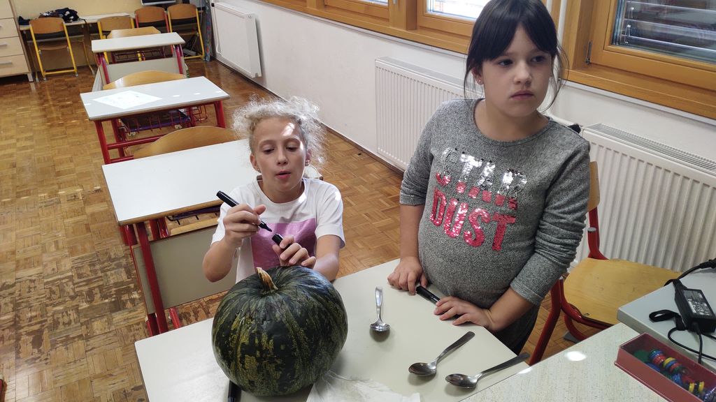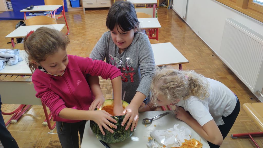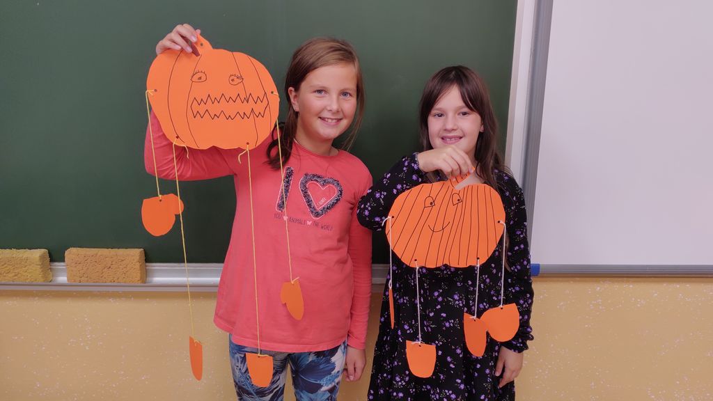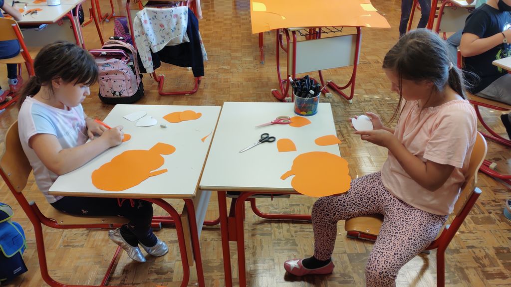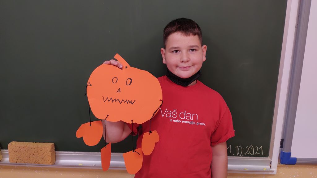 V mesecu oktobru smo se pri ustvarjalnicah posvetili temi jesen. Najprej smo si izdelali lutko – jesenski pridelek. Izbirali smo lahko med koruzo, bučo, korenjem in krompirjem. Za izdelavo smo potrebovali šeleshamer in volno. Nato smo se lotili jesenske okenske dekoracije razredov. Iz rjavega šeleshamra smo izrezali drevo in različno listje. Drevo in listje smo okrasili z voščenkami ter jih pritrdili na okna. Proti koncu meseca, ko se je bližala noč čarovnic, si je vsak učenec iz papirja izdelal netopirja, duhca in bučo. Najbolj smo bili navdušeni nad pravo poljsko bučo, saj smo jo spremenili v laterno in pri tem neznansko uživali. Sami smo jo izrezali in otrebili. Pri vseh opravilih smo se zelo zabavali.