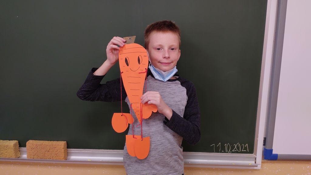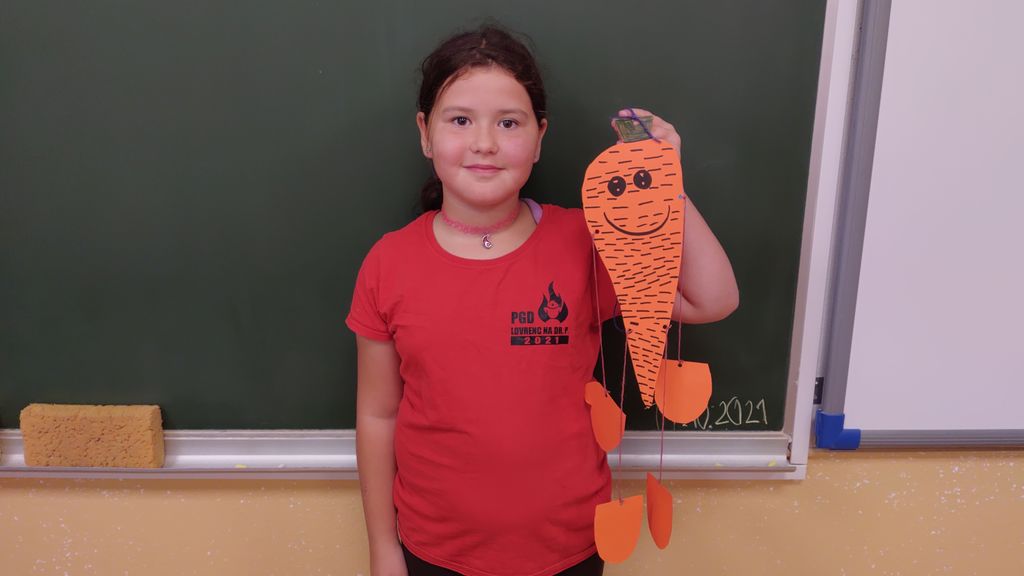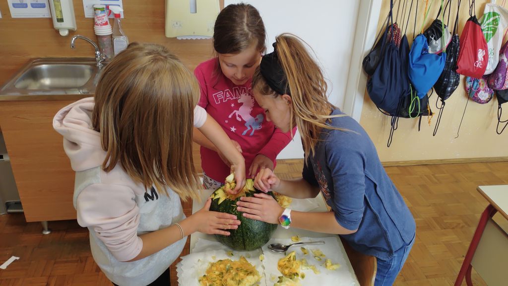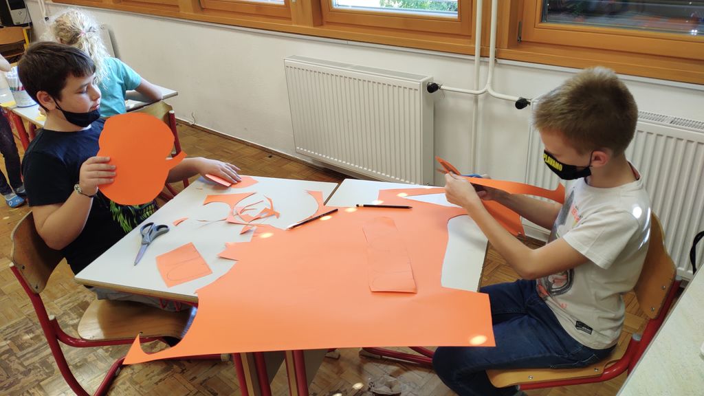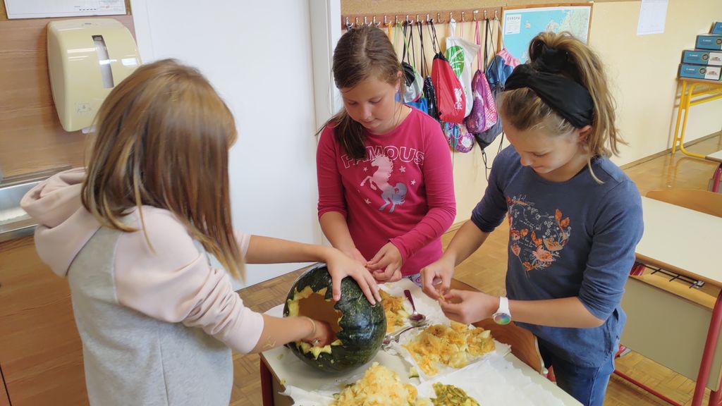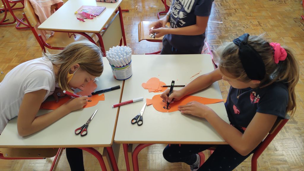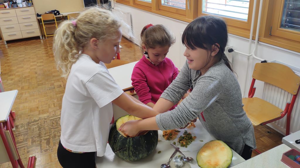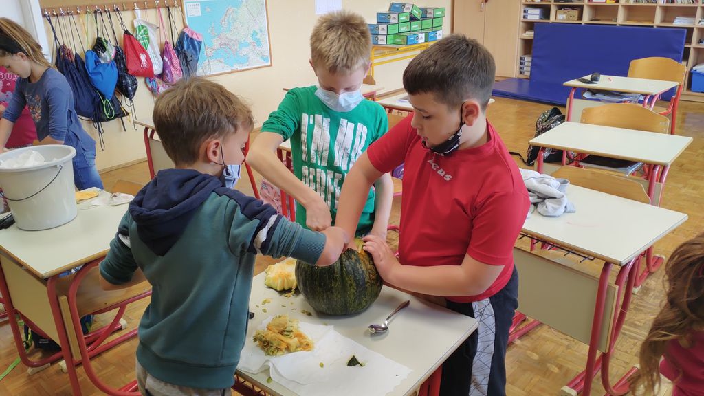 V mesecu oktobru smo se pri ustvarjalnicah posvetili temi jesen. Najprej smo si izdelali lutko – jesenski pridelek. Izbirali smo lahko med koruzo, bučo, korenjem in krompirjem. Za izdelavo smo potrebovali šeleshamer in volno. Nato smo se lotili jesenske okenske dekoracije razredov. Iz rjavega šeleshamra smo izrezali drevo in različno listje. Drevo in listje smo okrasili z voščenkami ter jih pritrdili na okna. Proti koncu meseca, ko se je bližala noč čarovnic, si je vsak učenec iz papirja izdelal netopirja, duhca in bučo. Najbolj smo bili navdušeni nad pravo poljsko bučo, saj smo jo spremenili v laterno in pri tem neznansko uživali. Sami smo jo izrezali in otrebili. Pri vseh opravilih smo se zelo zabavali.